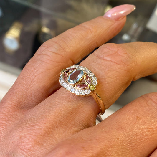 9ct Gold Aquamarine, Pink Tourmaline, Peridot & Diamond Ring