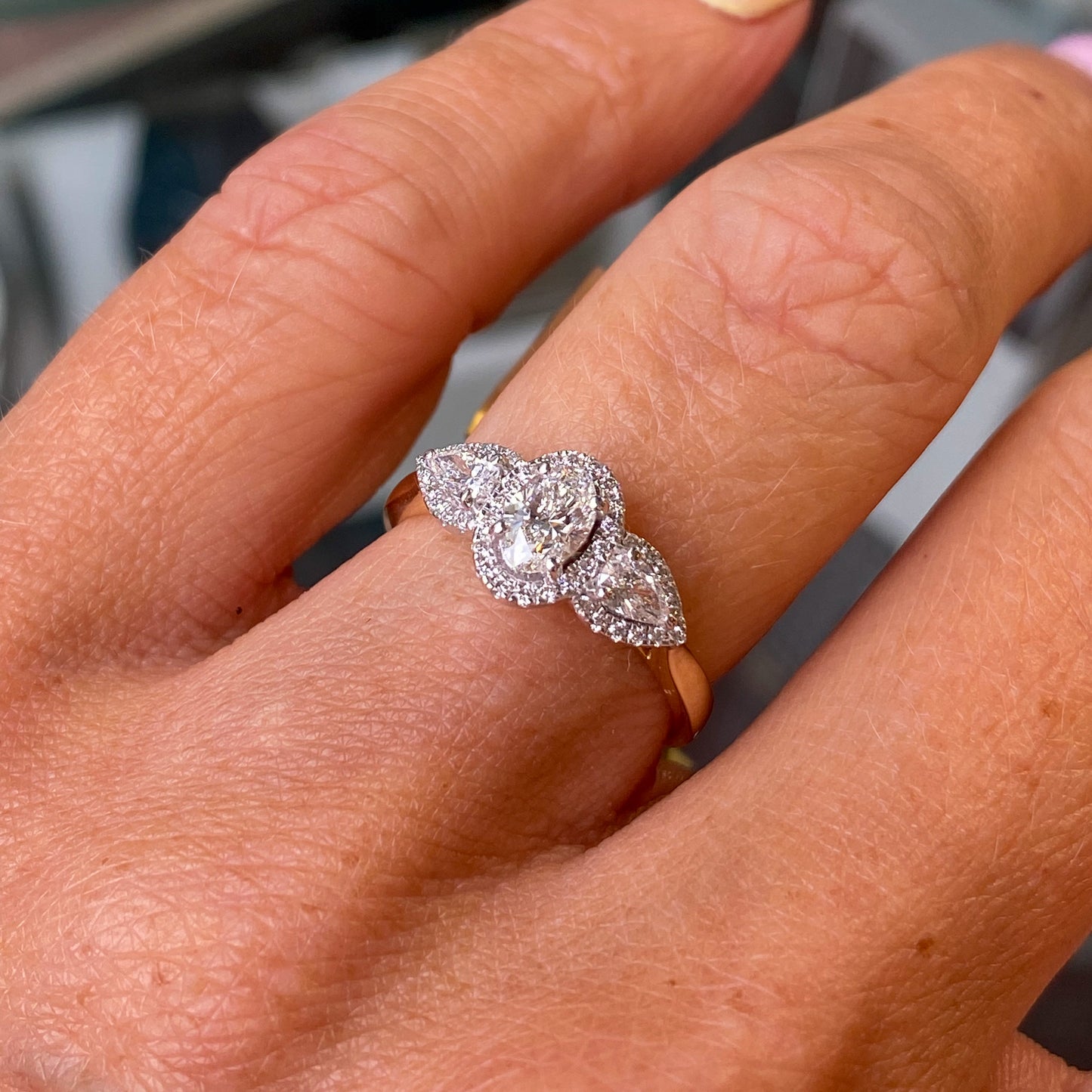 18ct Gold Oval Halo Trilogy Garland Diamond Engagement Ring 0.77ct in total. This exquisite diamond engagement ring comprises a centre oval diamond, two pear cut diamonds and round brilliant cut diamonds surrounding.