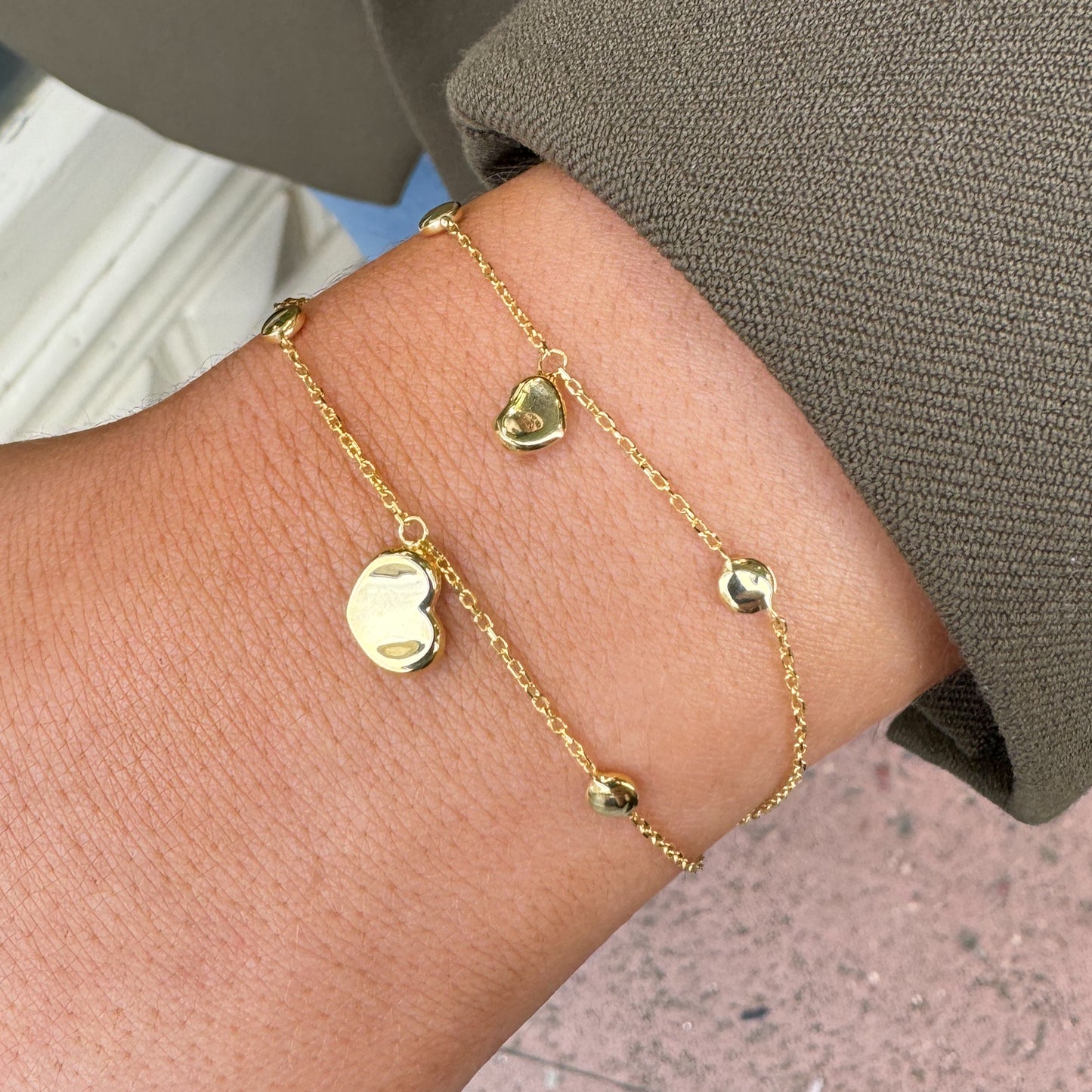 9ct Gold Double Bead & Heart Discs Station Bracelet