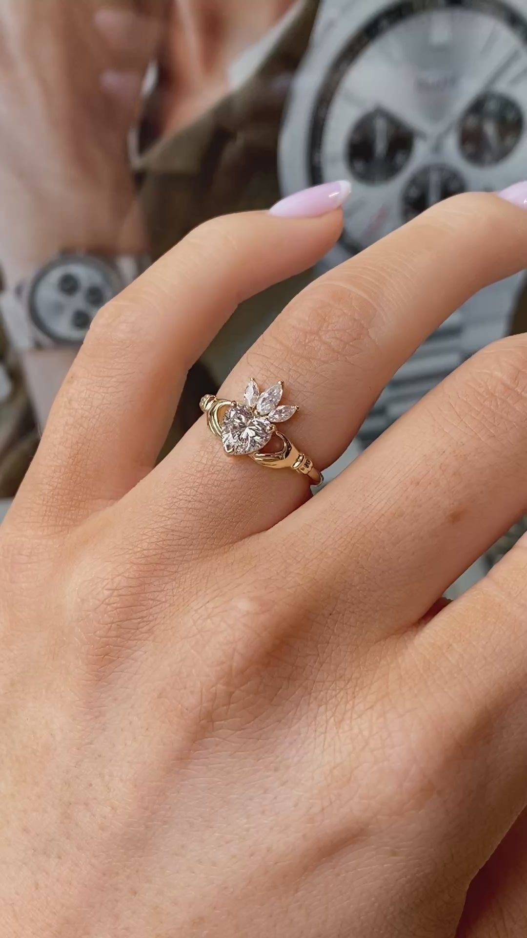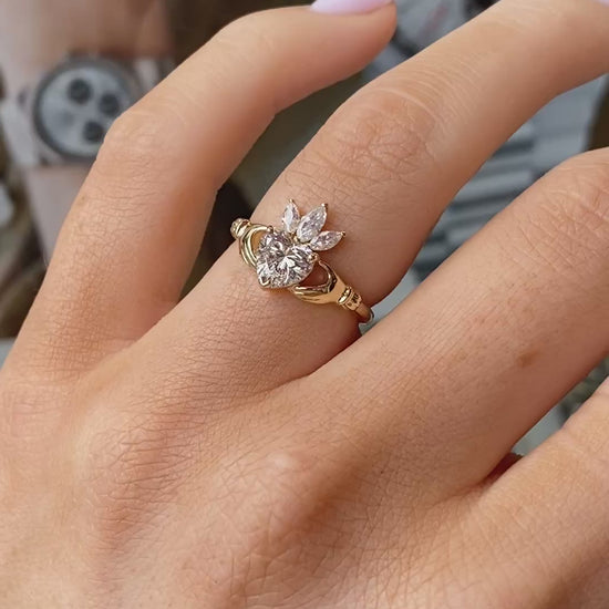 The sweet design of the Celtic Claddagh symbol with two hands supporting a crown topped with a crown on this Ladies 9ct Gold Claddagh Ring is beautifully enhanced with a selection of heart and marquise cut lab diamonds encrusted throughout the symbol to create a truly elegant accessory.