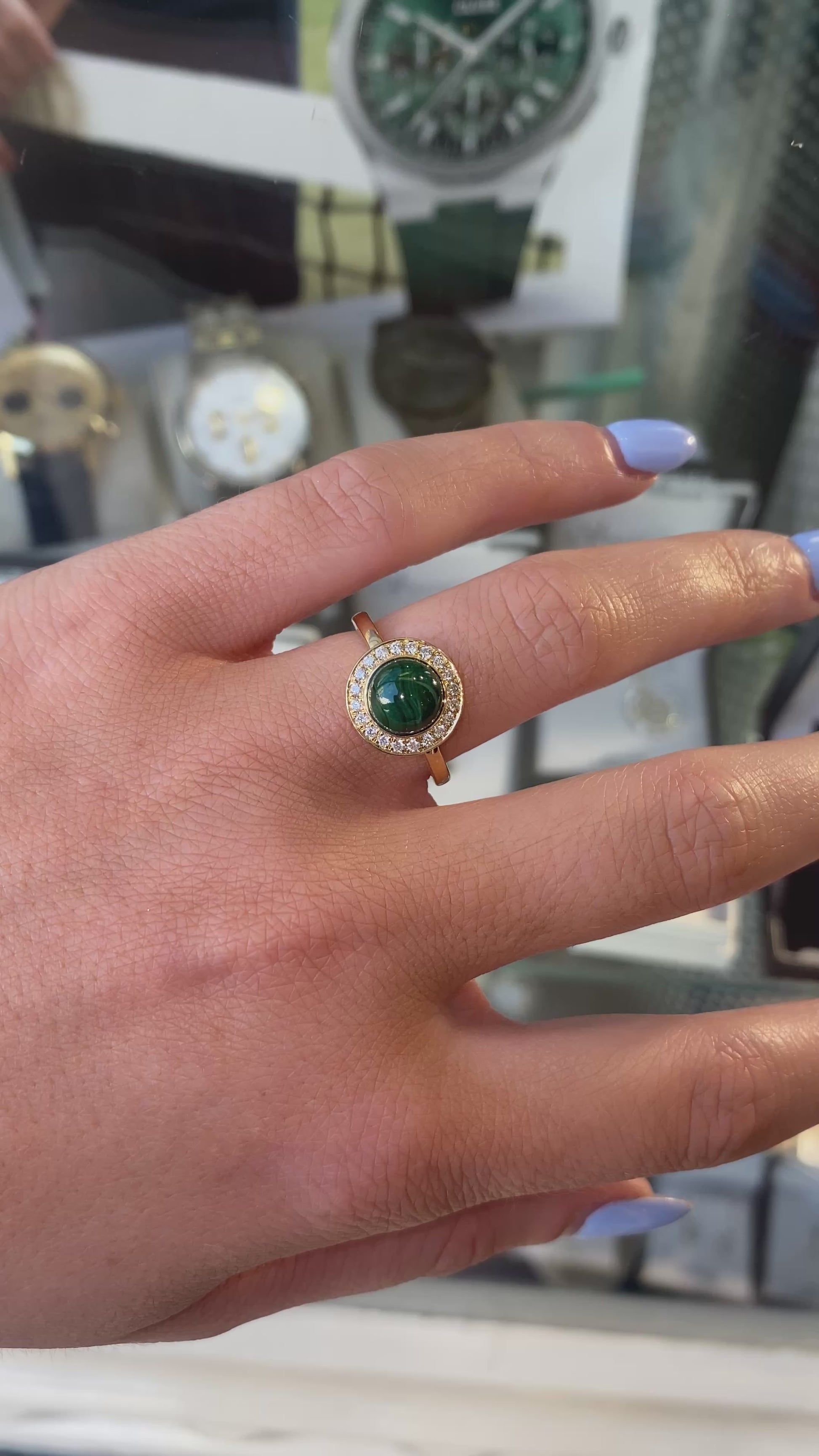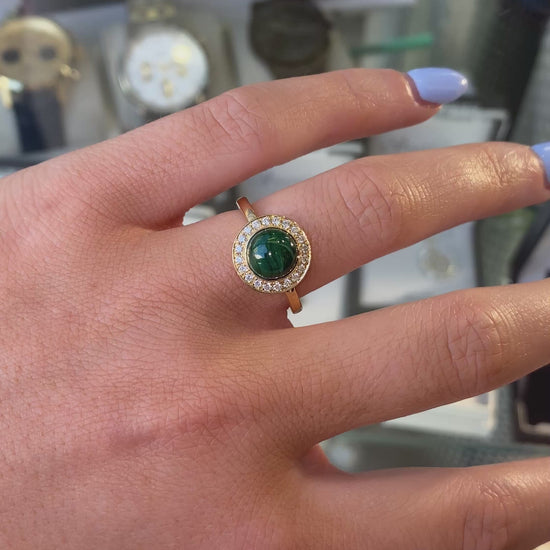 This stunning ring features a captivating malachite at its centre, surrounded by a halo of sparkling diamonds. The elegant dome design is set in polished gold, making it the perfect accessory for any occasion.