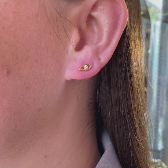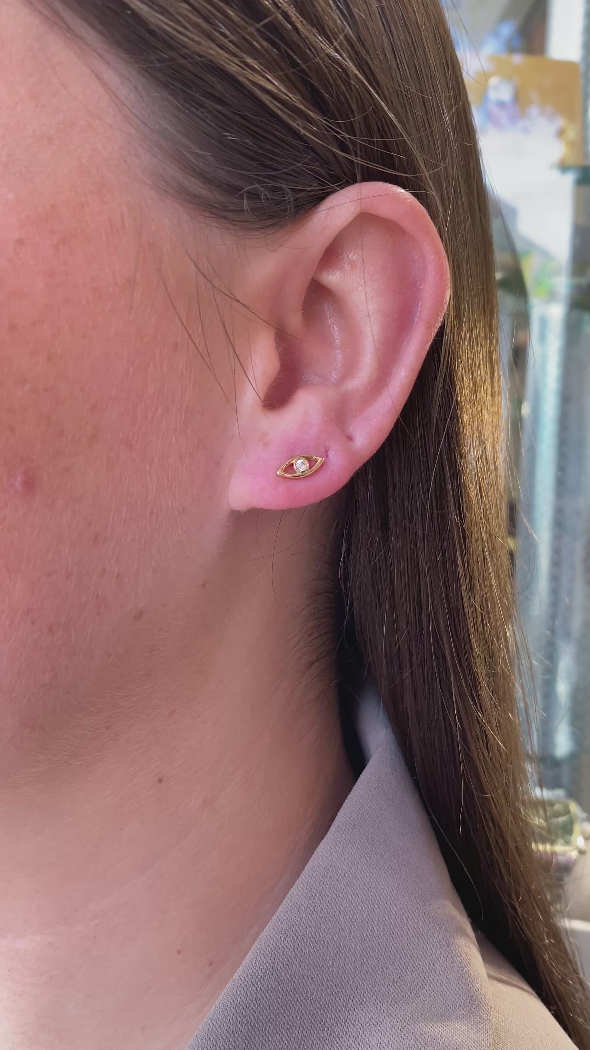 These delightful evil eye stud earrings feature a single sparkling CZ, beautifully framed in gold. Perfect for adding a touch of whimsy to any outfit, they are ideal for both casual and formal occasions. Show your love for unique accessories with these charming pieces.