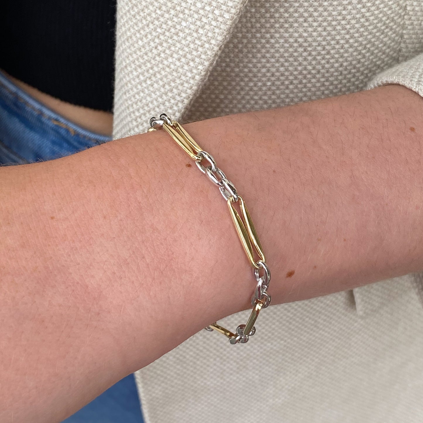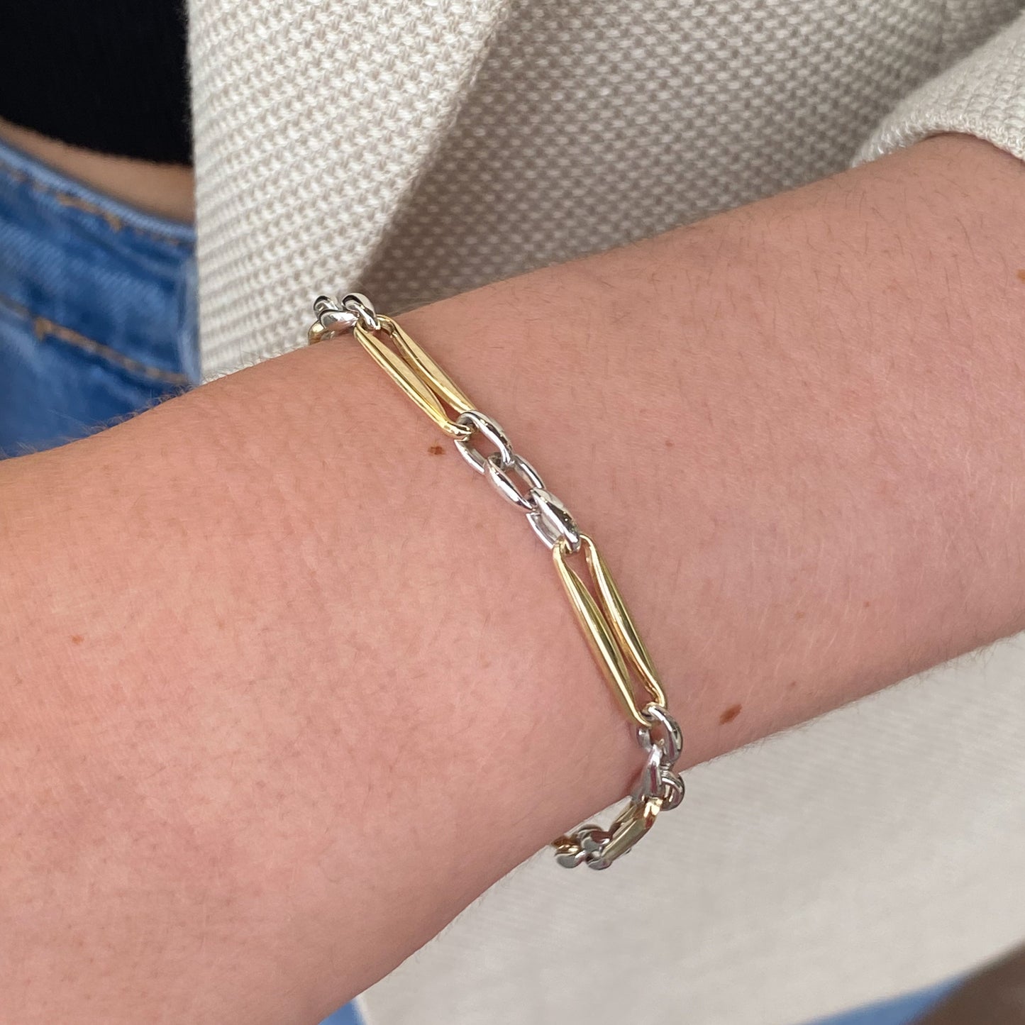 This beautiful 9ct Gold Two Tone Modern Figaro Bracelet has yellow and white gold links. This is an excellent choice as the two colours of gold ensure that you can wear it with anything.