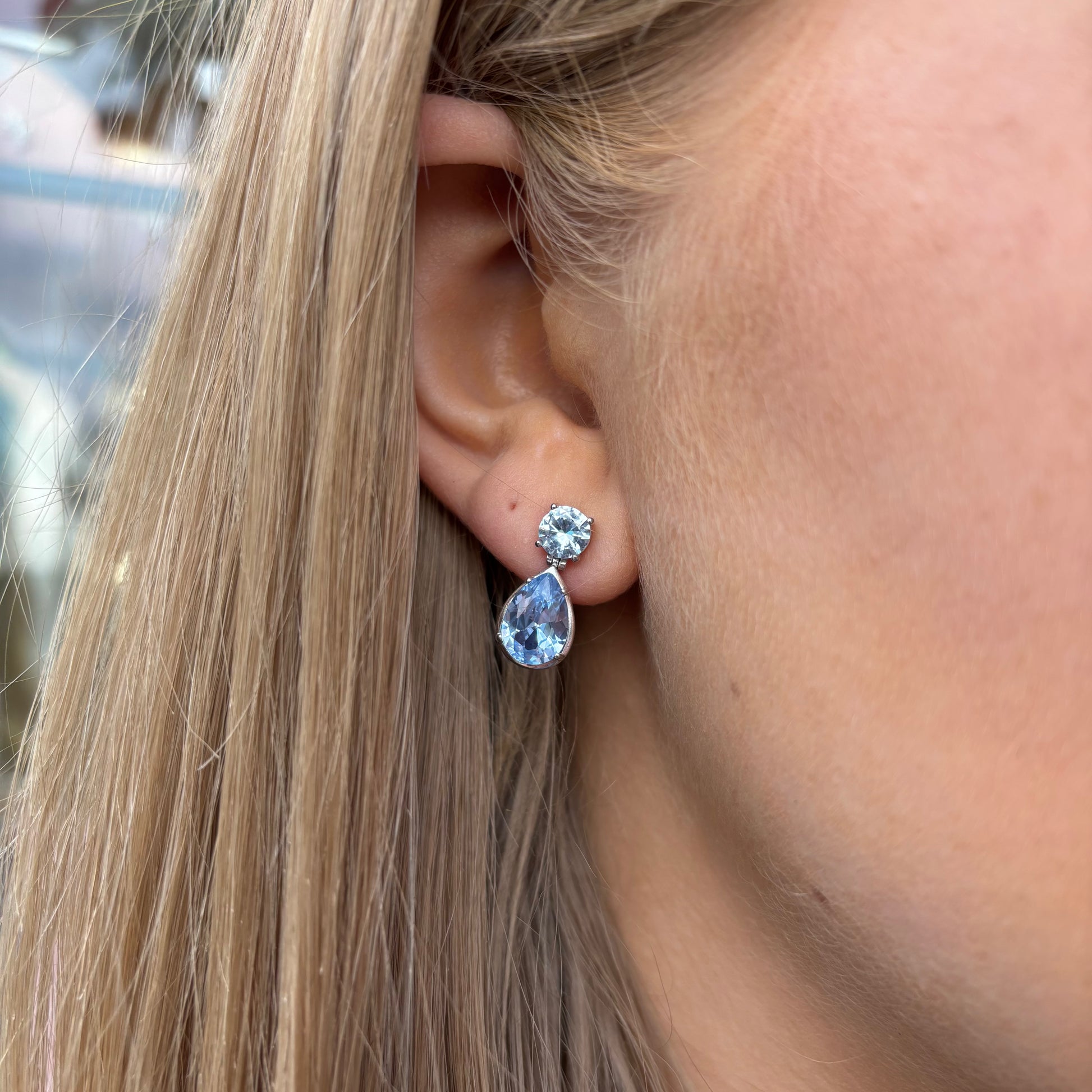 Silver Aqua Pear CZ Drop Earrings | 5.5mm & 7x10mm | 925 Silver Rhodium Plated