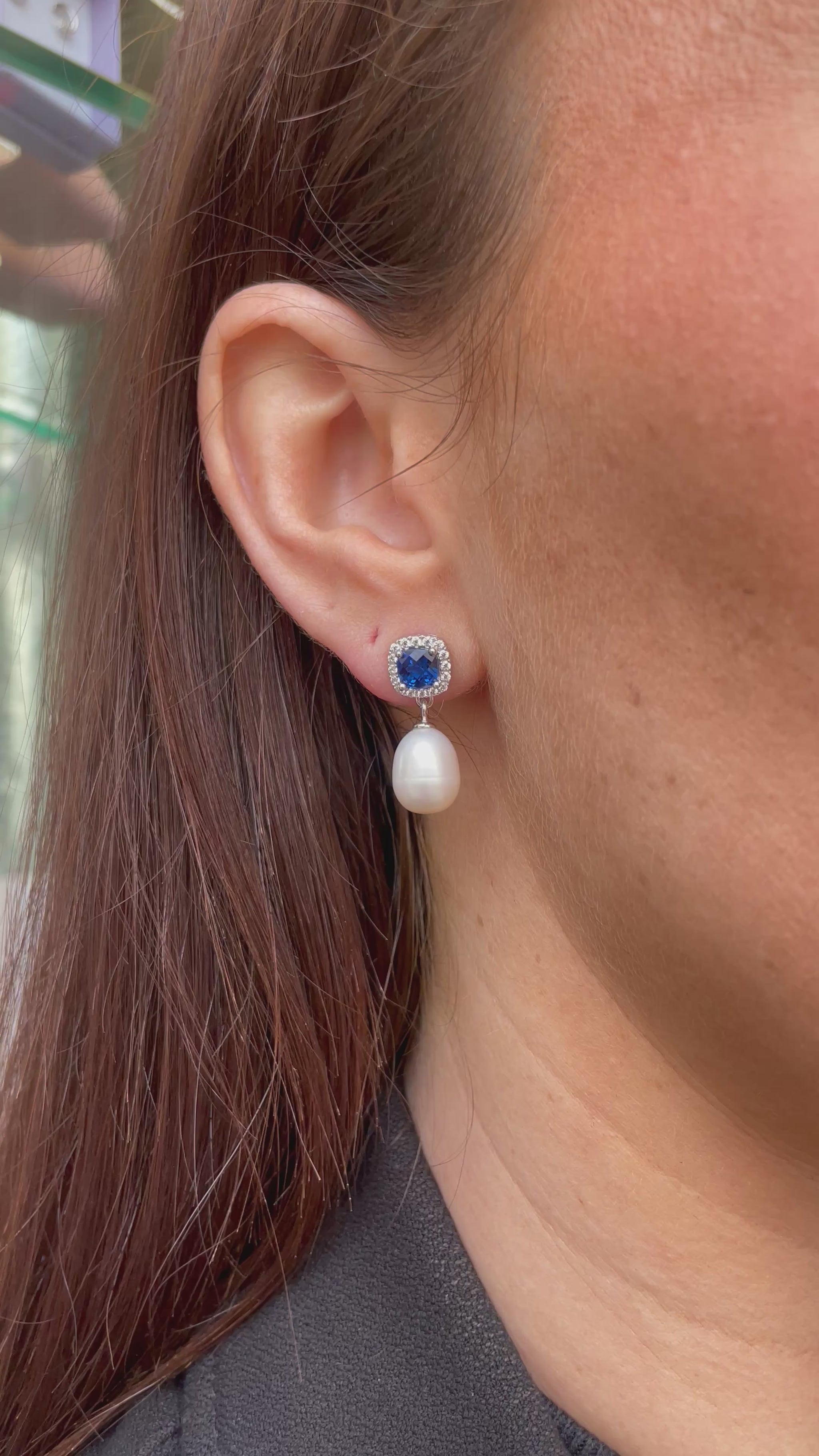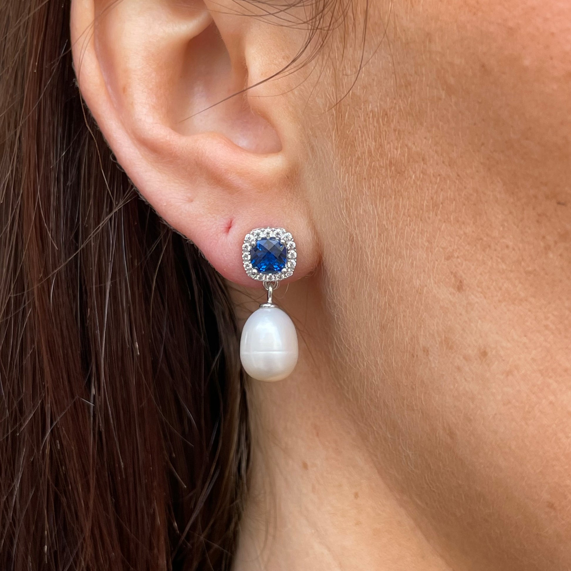 Silver Blue CZ & 9x11mm Freshwater Pearl Drop Earrings | 925 Silver Rhodium Plated