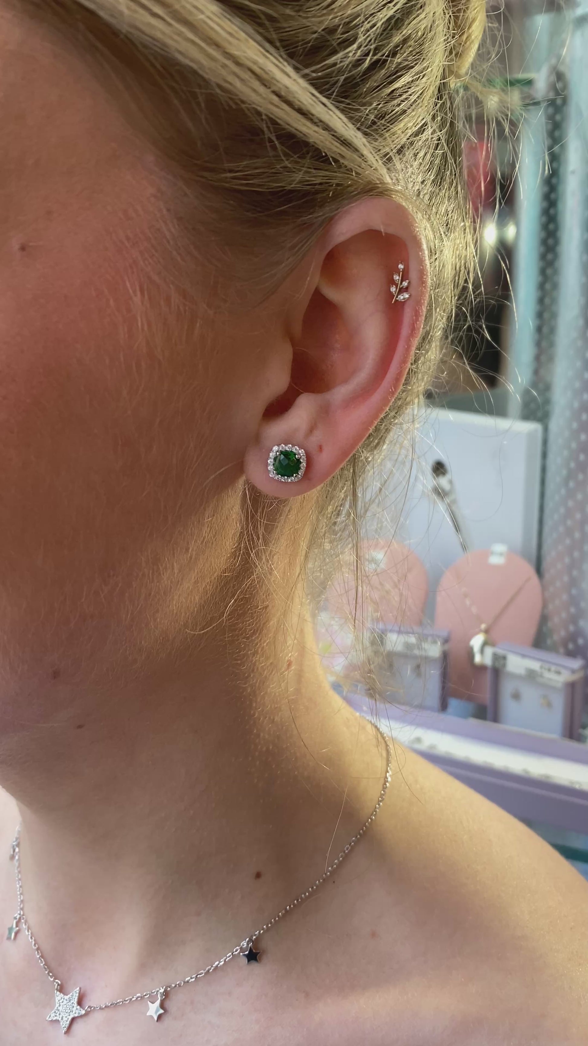 Silver Cushion Halo Stud Earrings | Emerald Green