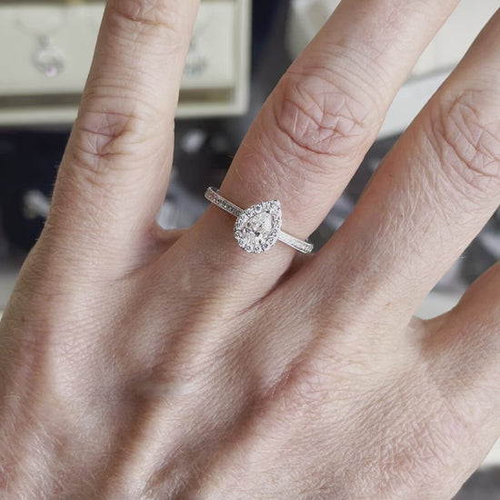 18ct Gold 0.56ct GHSI Pear Cut Solitaire Halo Diamond Ring