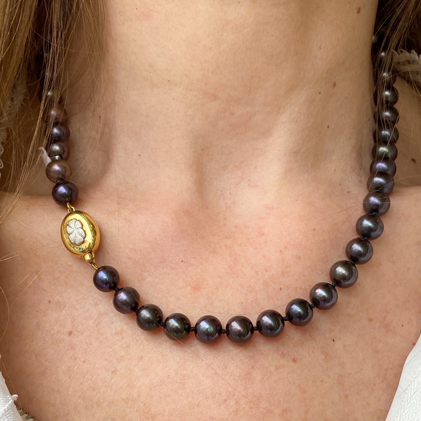 Achieve sophisticated elegance with this 18ct Gold Akoya Pearl Necklace. Handcrafted from the highest quality materials, the necklace features eye-catching aubergine Akoya Pearls suspended from a stunning loop chain. A classic piece perfect for any luxury occasion.