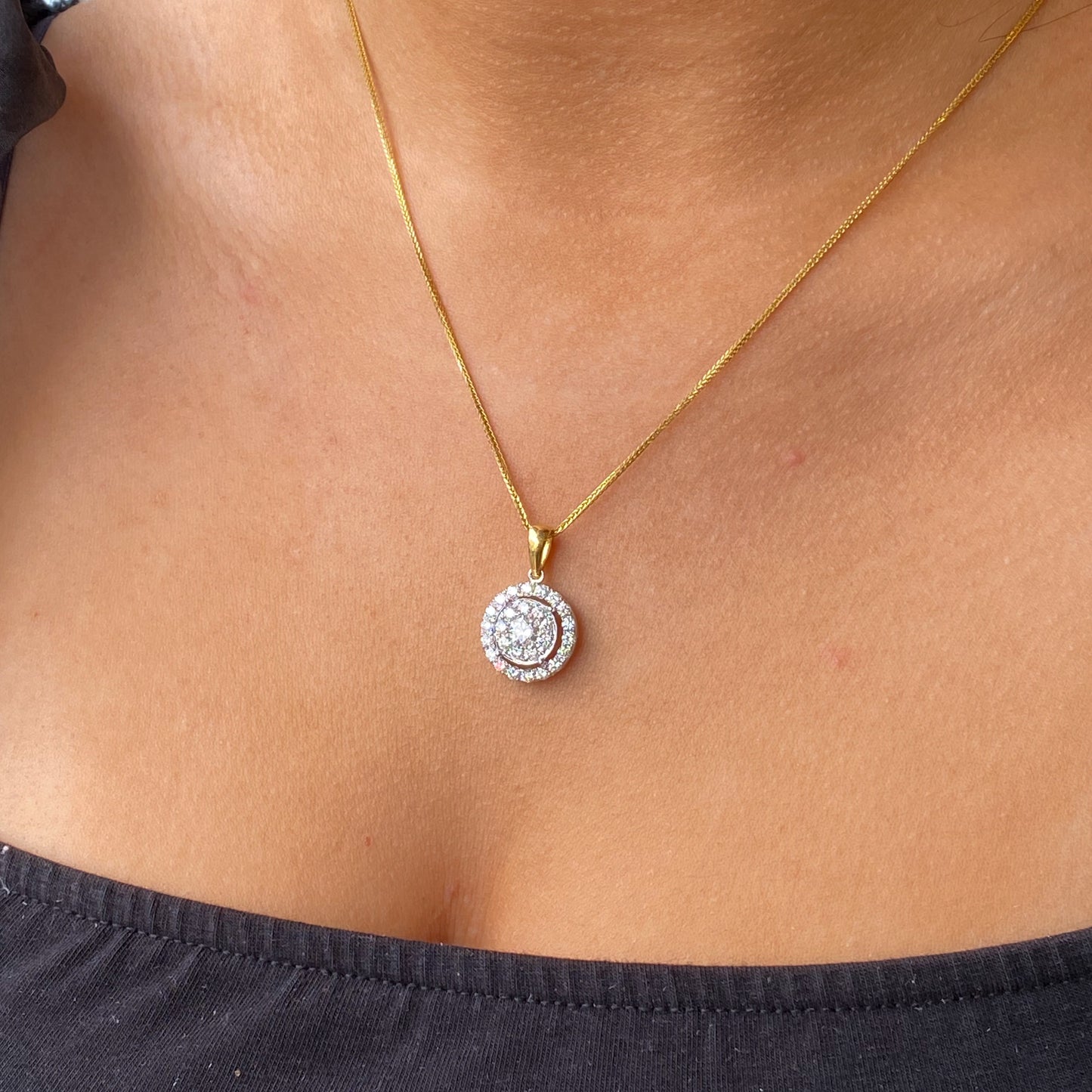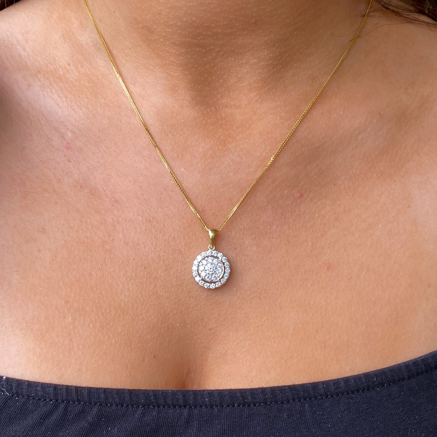 Make your mark in the world with this dazzling diamond-studded pendant! Crafted from 18ct gold in a luxurious halo setting, this pendant sparkles like no other with its 1.27ct of shiny, radiant diamonds. Ready to make a statement? This stunning 14mm-wide pendant is your best bet!