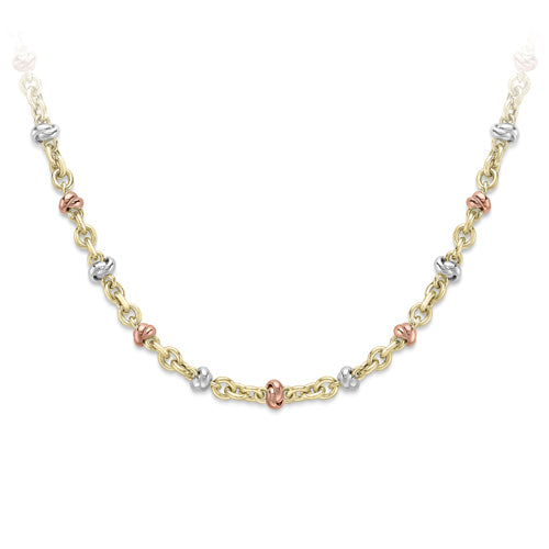 This heavy and luxurious 9ct yellow gold necklace has rose gold and white gold love knots along the length. Chunky gold bracelets and necklaces are the next big thing. This is an excellent choice as the three colours of gold ensure that you can wear it with anything.