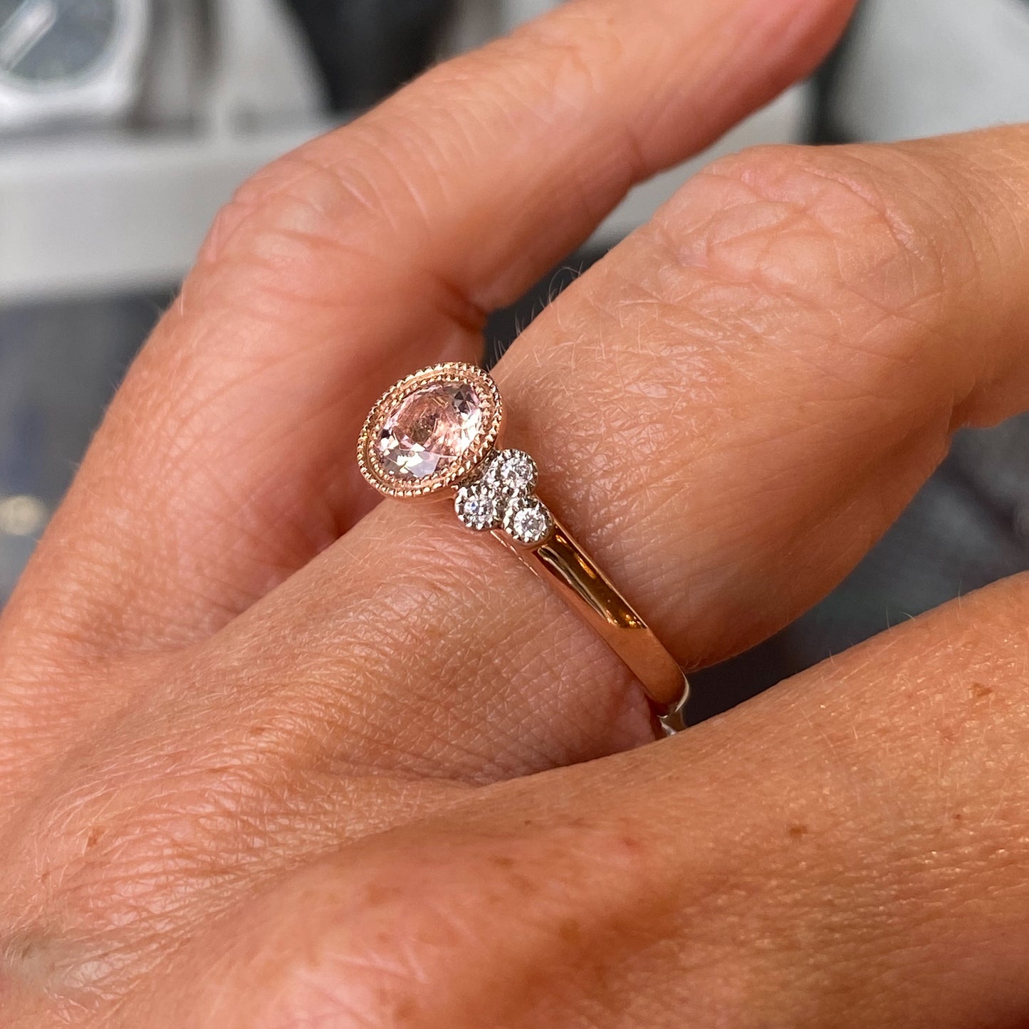 A Morganite solitaire with a millgrain edge with a trilogy of Diamonds either side.