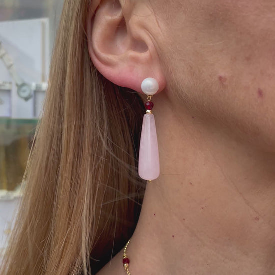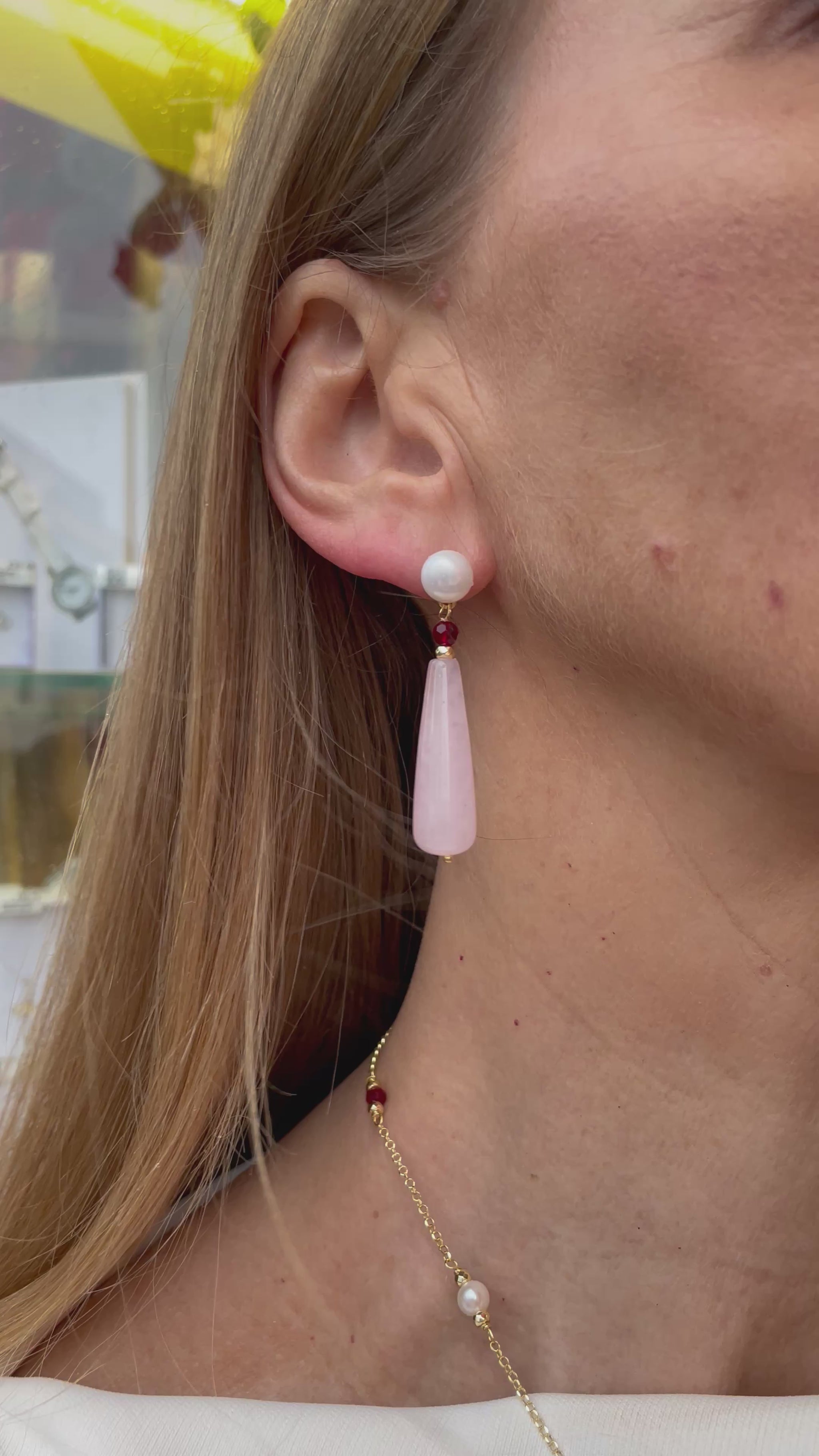 This triple bracelet is made of gold plated 925 silver, set with pearl, rose quartz, and red hot stones.