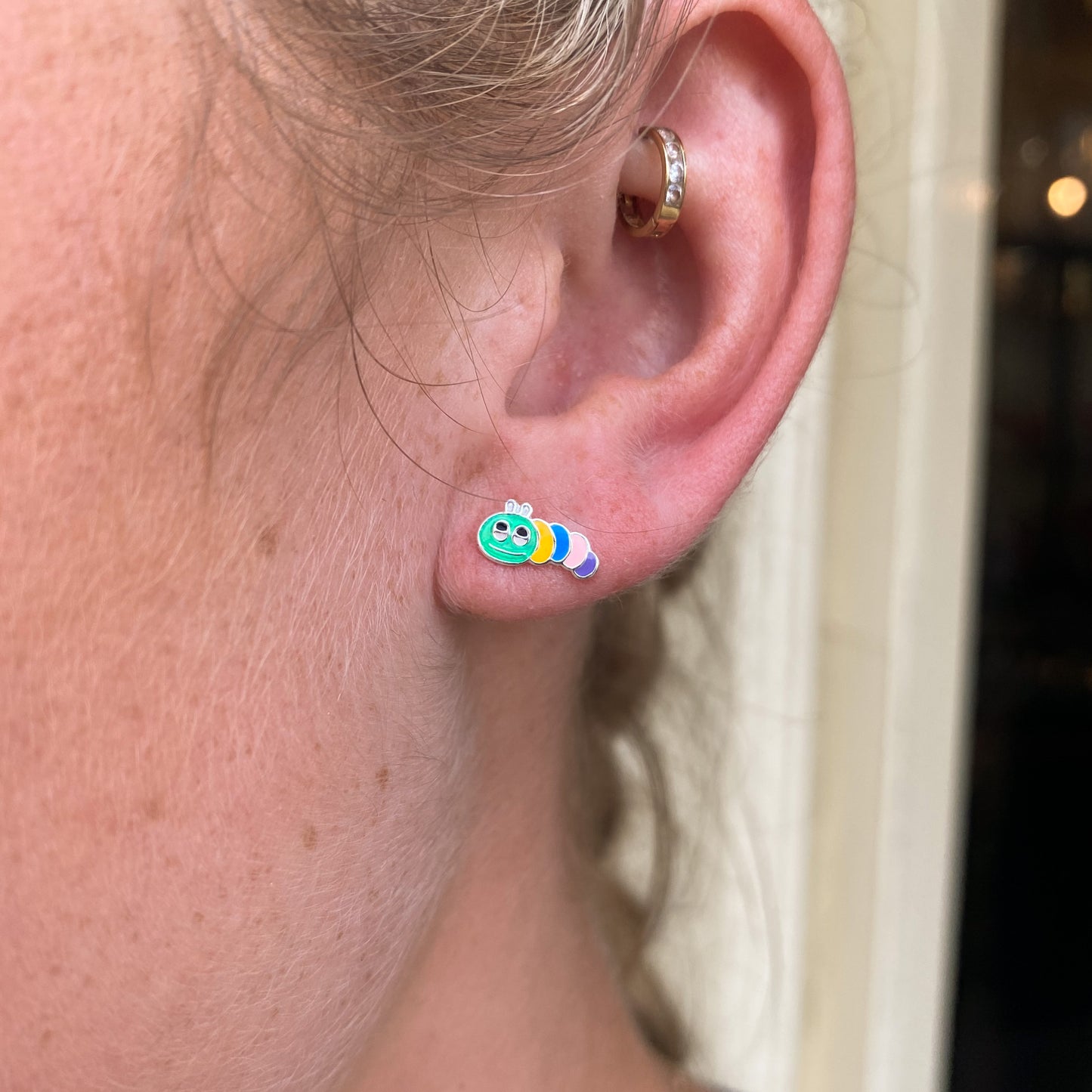 Brighten up your look with these sweet little caterpillar earrings with rainbow enamel. Ideal for a gift or for a nature lover, these studs measure in at 5.2mm in height and 10mm in length.