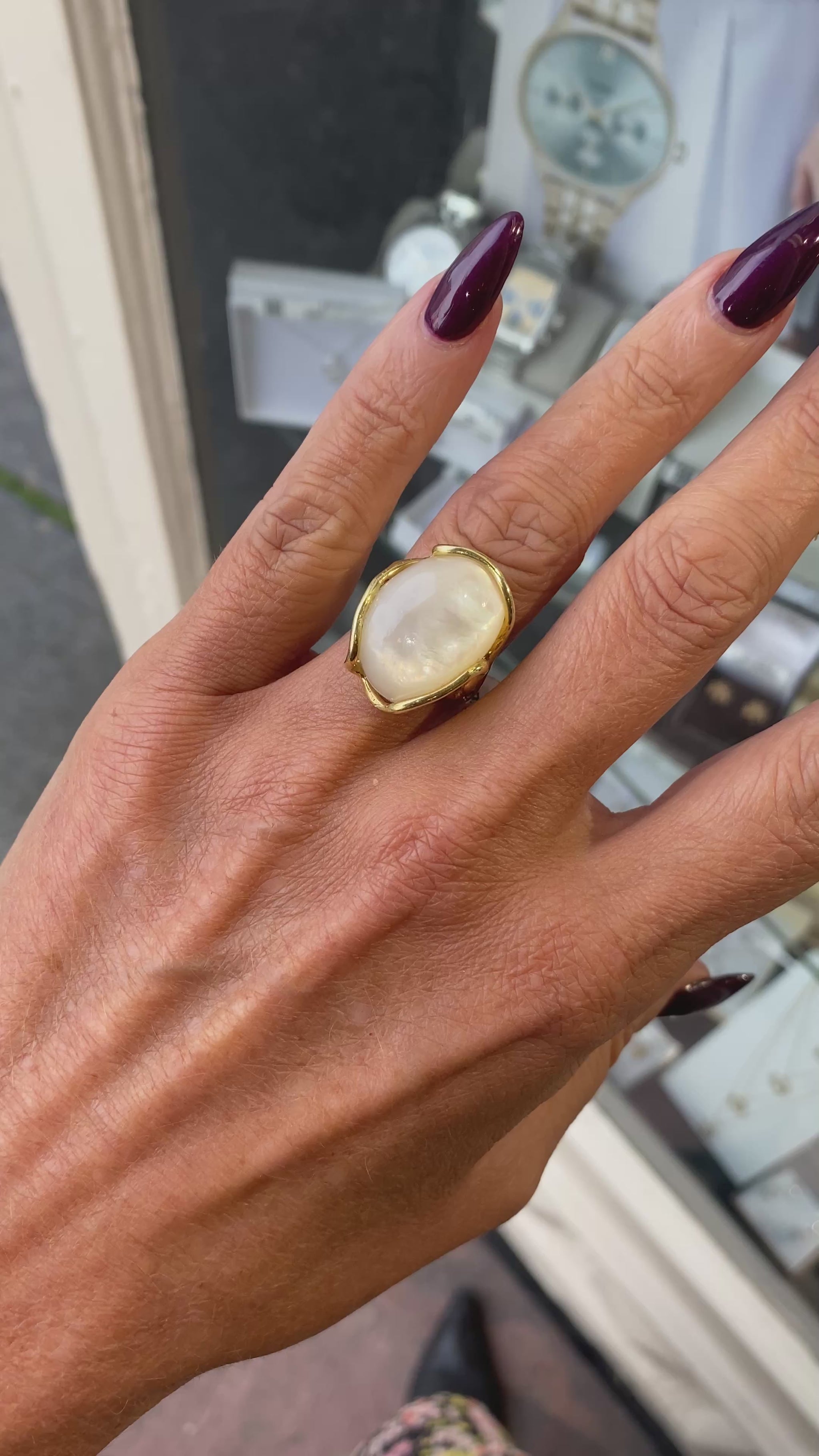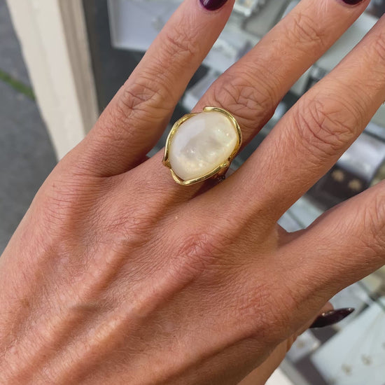925 Silver, Gold Plated Baroque Mother of Pearl Ring.