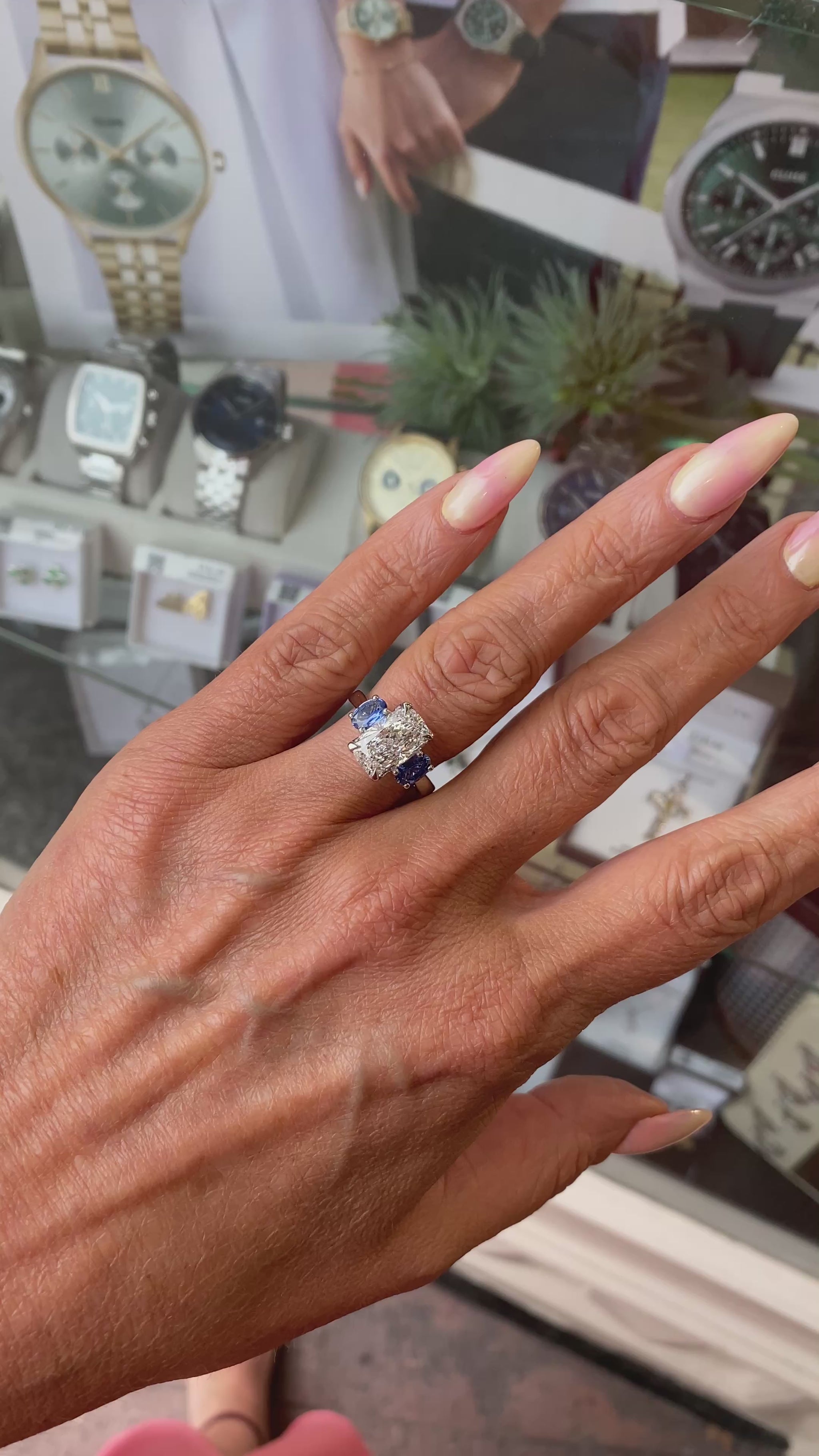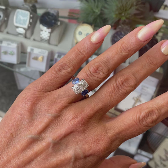Platinum Elongated Cushion & Sapphire Trilogy Ring