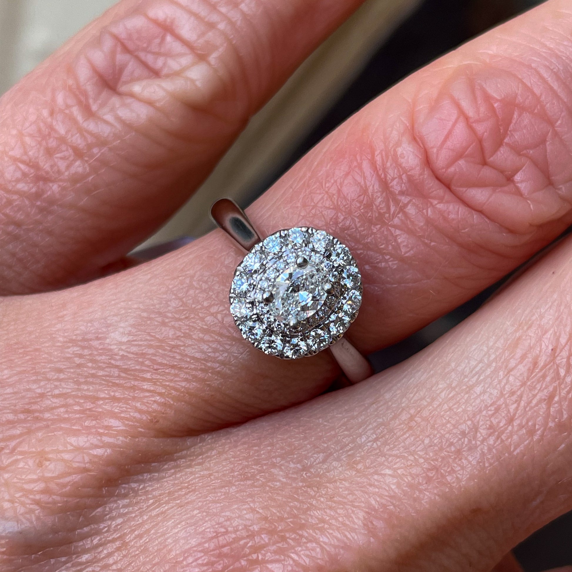 One platinum diamond engagement ring. Double halo with Oval Cut Diamond in the centre.