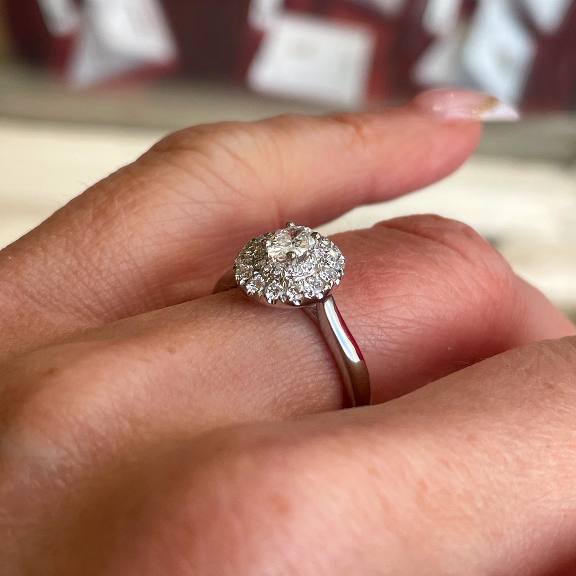 Ultra glam and super stylish. Our Mari ring features a beautiful certificated G colour oval cut diamond surrounded by a double halo of castle set round brilliant cut diamonds.
