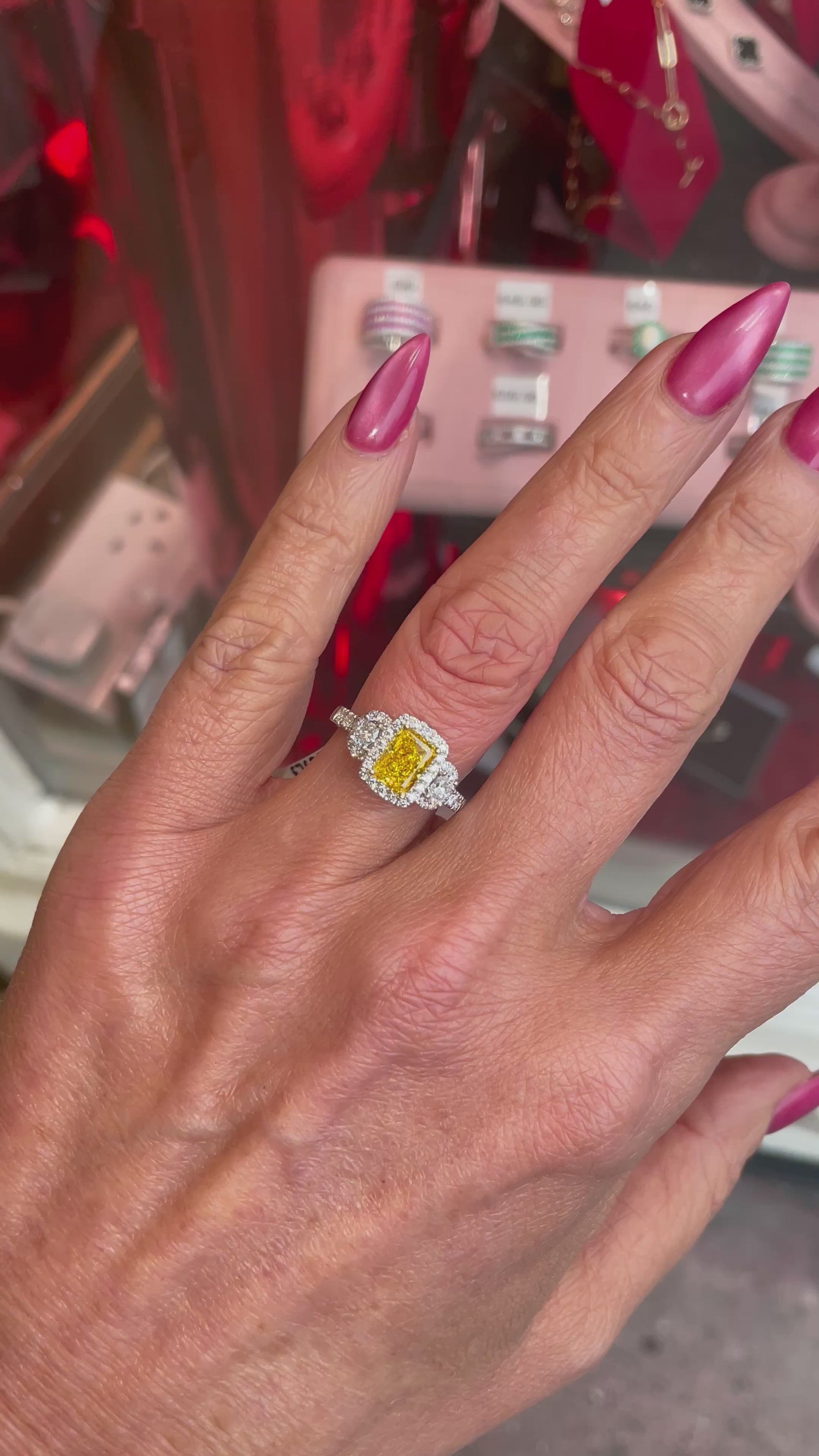 In the centre: A single radiant cut synthetic diamond 1.21ct Vivid Yellow SI2 IGI Certified