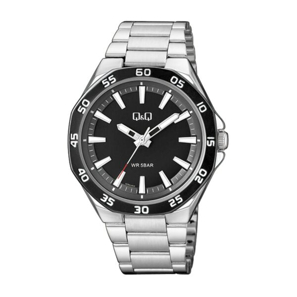 This Q&Q gents watch has a striking black dial with white accents and a silver linked bracelet.