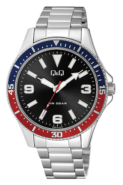 This Q&Q gents watch has a classic silver linked bracelet with both polished and matte links and a striking black dial in a blue and red bezel.