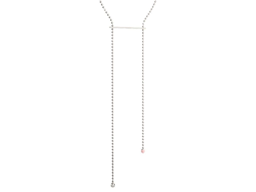 This silver chain is part of Rebecca's Boulevard Stone collection. It has a beautiful beaded chain with two pink hotstone charms on the ends.