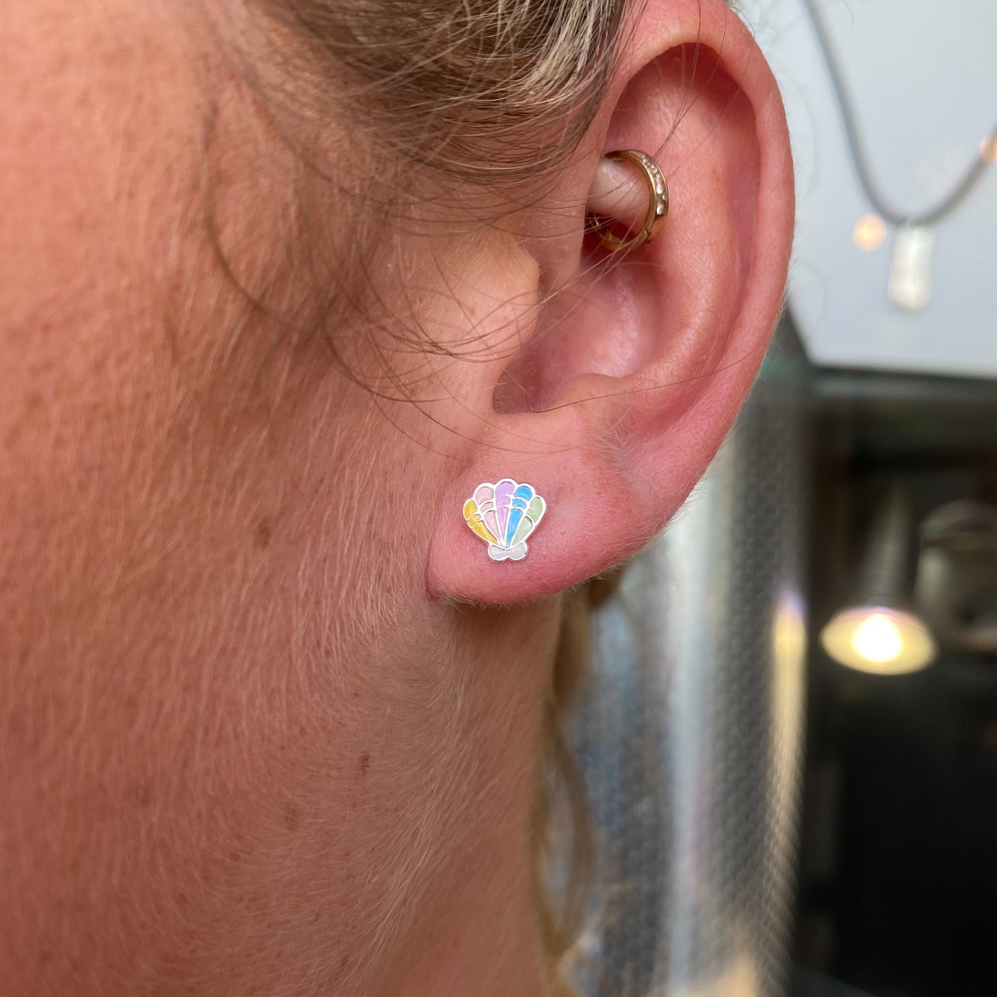 Add some colour to your look with these beautiful shell stud earrings with rainbow enamel. Bright and on-trend, these studs measuring 8mm x 8mm are sure to add something special to your jewellery collection, especially for a summer style!