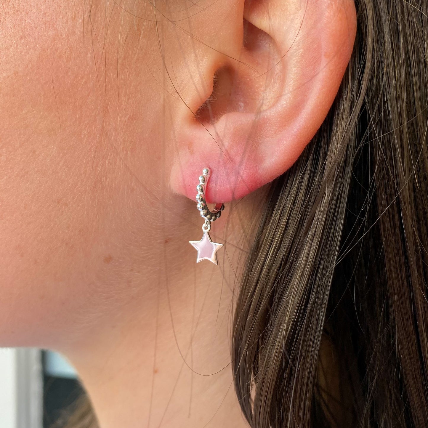 Silver Beaded Huggie Hoop Earrings with a star charm | 13mm | 925 Silver