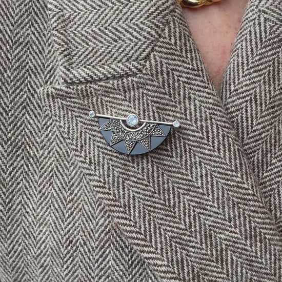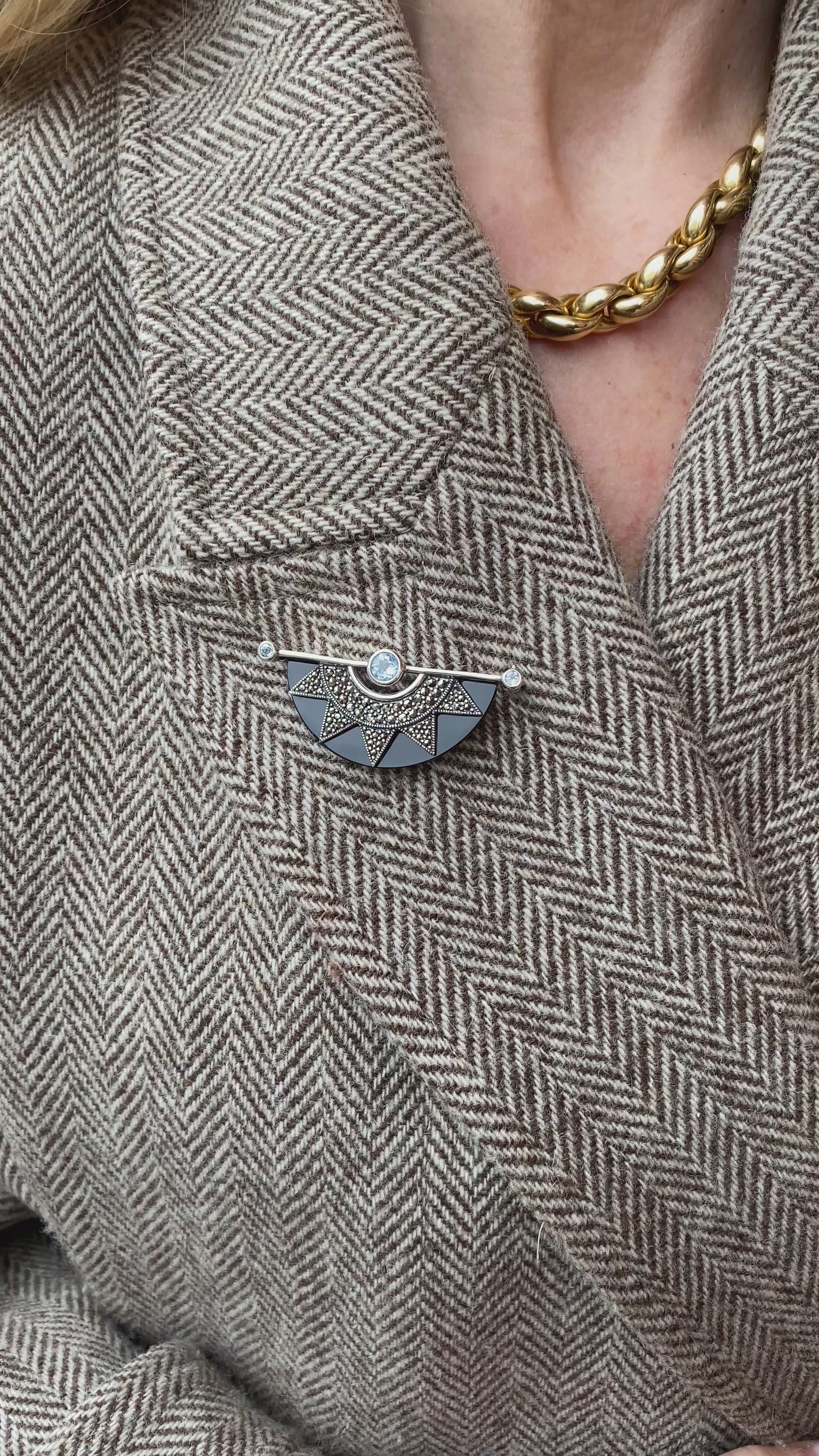 Silver Blue Topaz, Marcasite & Onyx Deco Fan Brooch