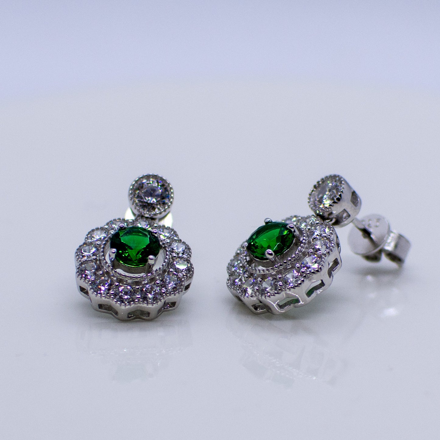 Silver Created Emerald CZ Halo Drop Earrings | 925 Silver, 12mm W x 18mm L