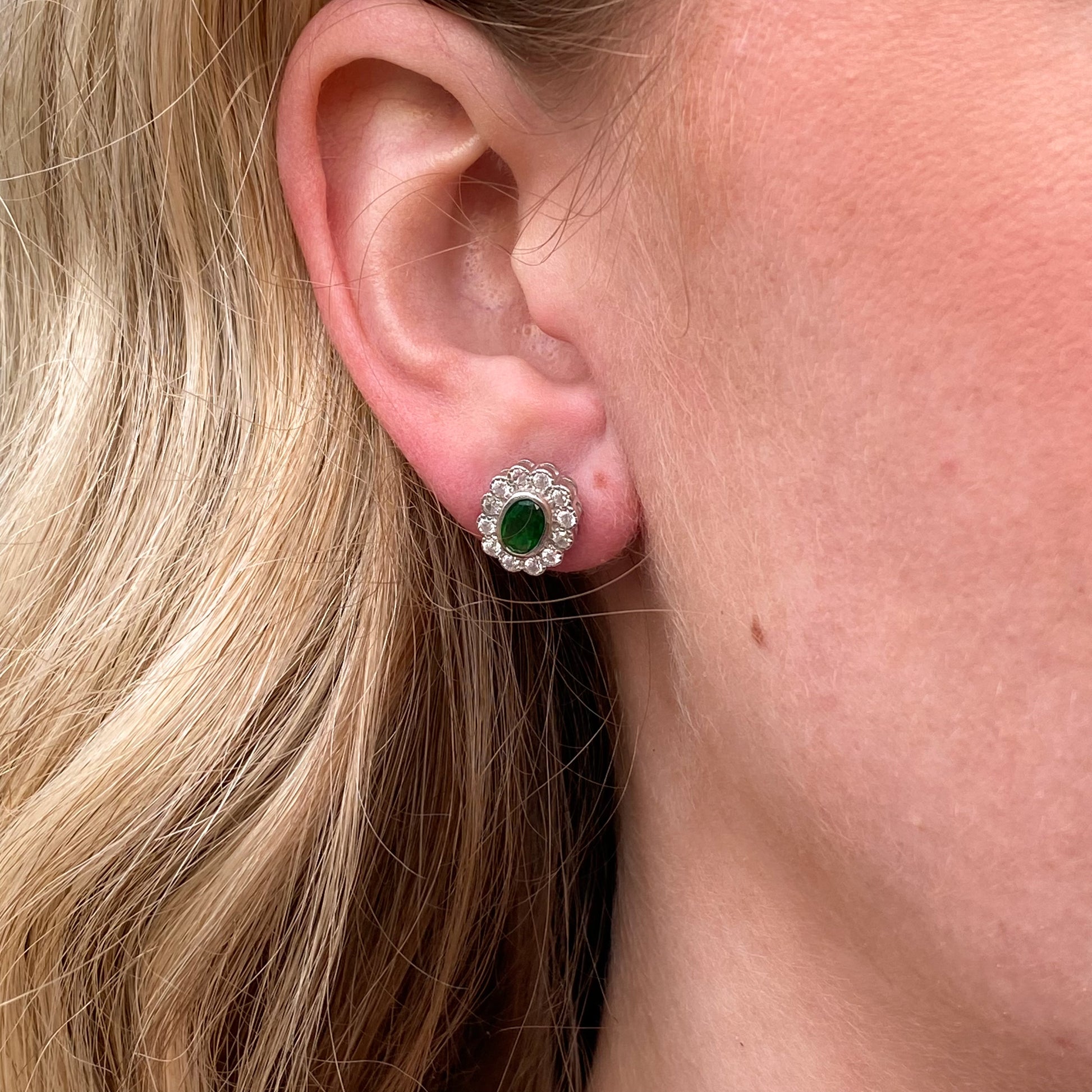 Silver Created Emerald CZ Vintage Oval Stud Earrings | 925 Silver, 10mm W x 12mm L