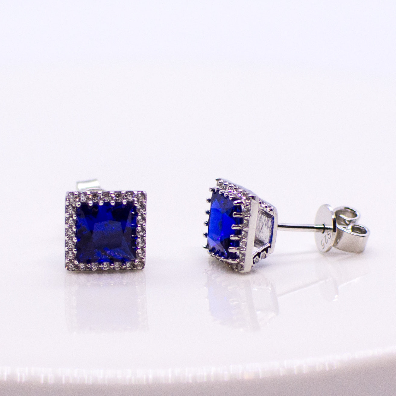 Silver Created Sapphire Square Halo Stud Earrings - 925 Silver