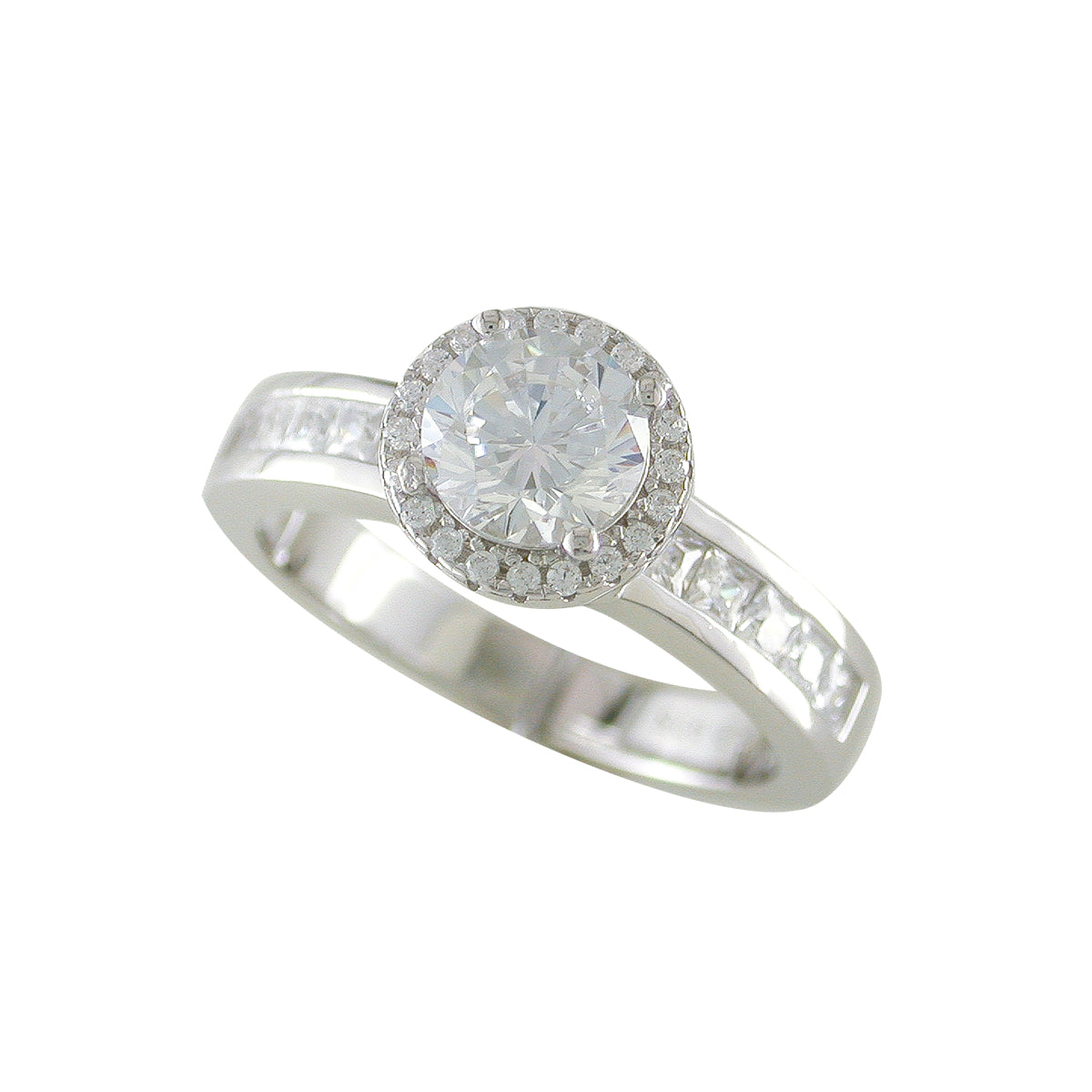 Four claw set CZ Solitaire with halo and shoulders set with CZs