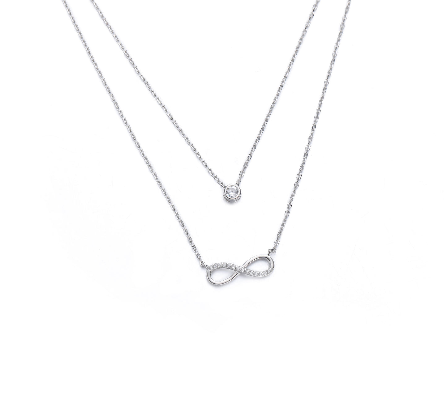 A pretty double necklace with a bezel set CZ on the upper chain and a CZ set infinity on the lower chain.