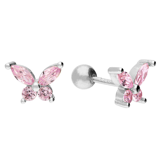Silver CZ Pink Butterfly Stud Earrings | Screw Backs