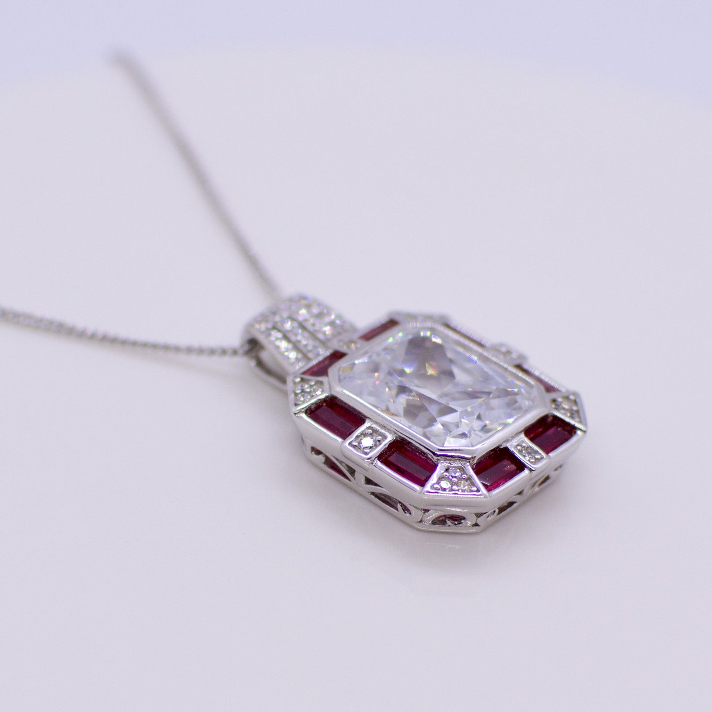 Silver CZ Rectangular Pendant Necklace - Created Ruby - 18" silver diamond cut curb chain.