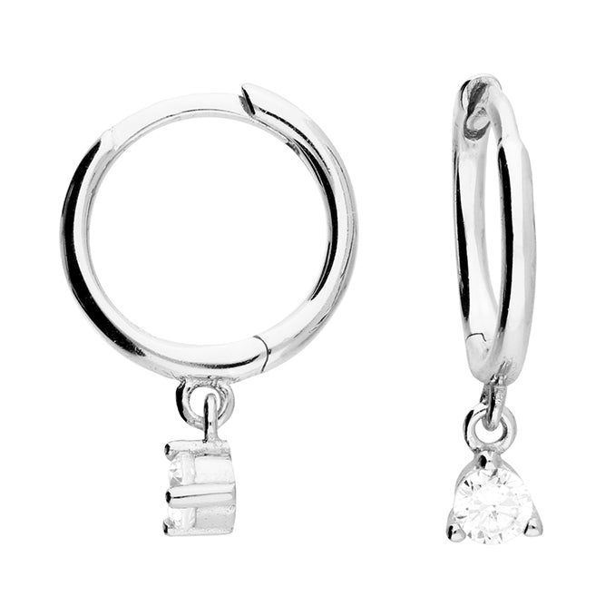 Silver CZ Solitaire Charm Huggie Hoop Earrings | 10mm