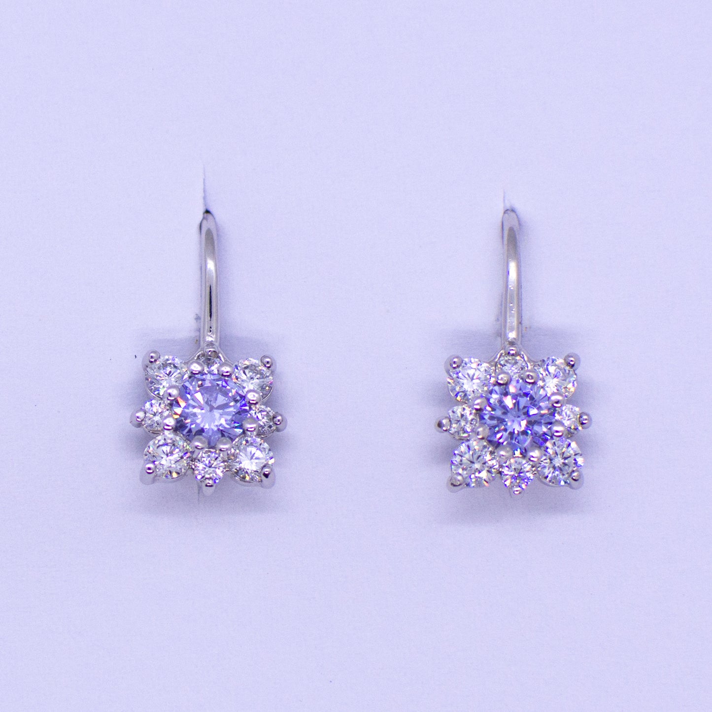 Silver CZ Square Halo Drop Earrings - Created Light Amethyst - German Wires