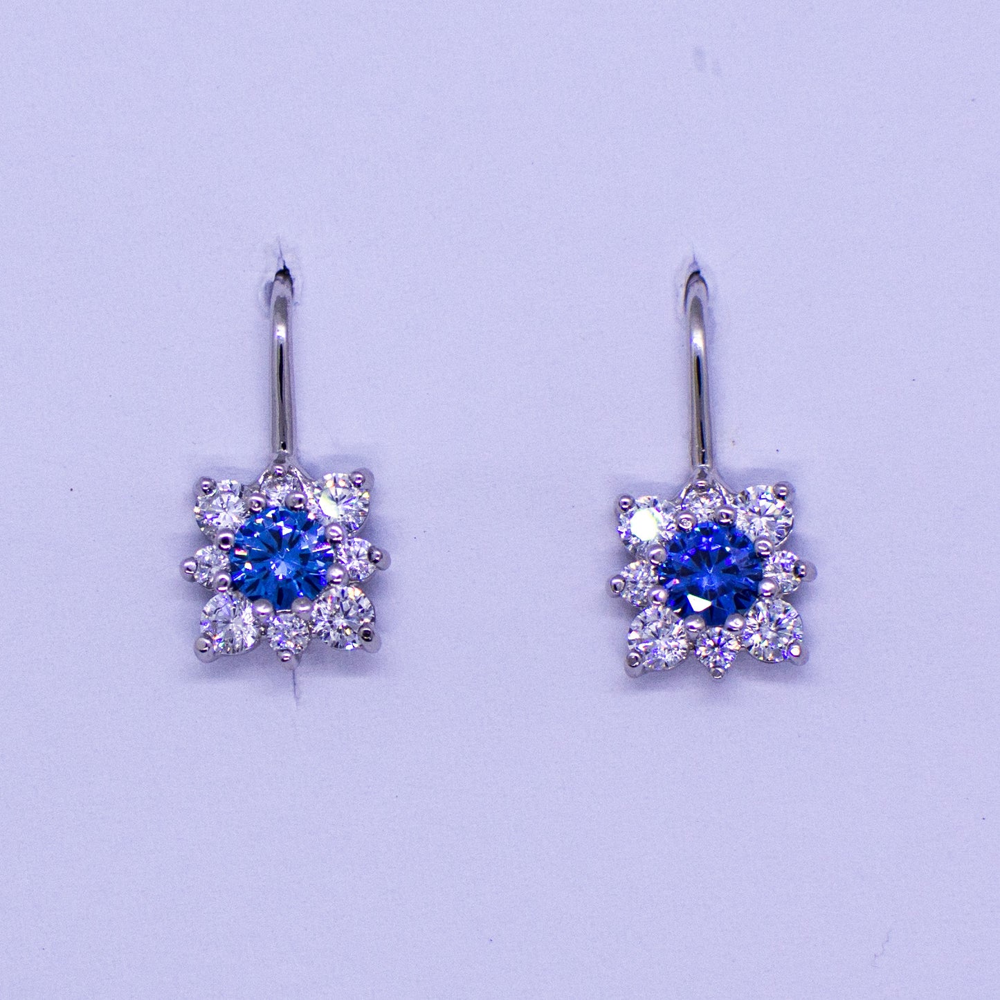 Silver CZ Square Halo Drop Earrings - Created Sapphire - German Wires
