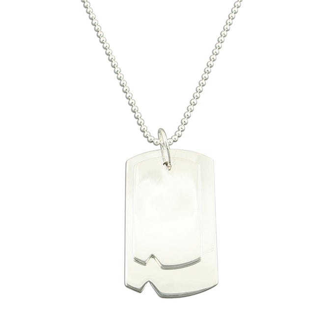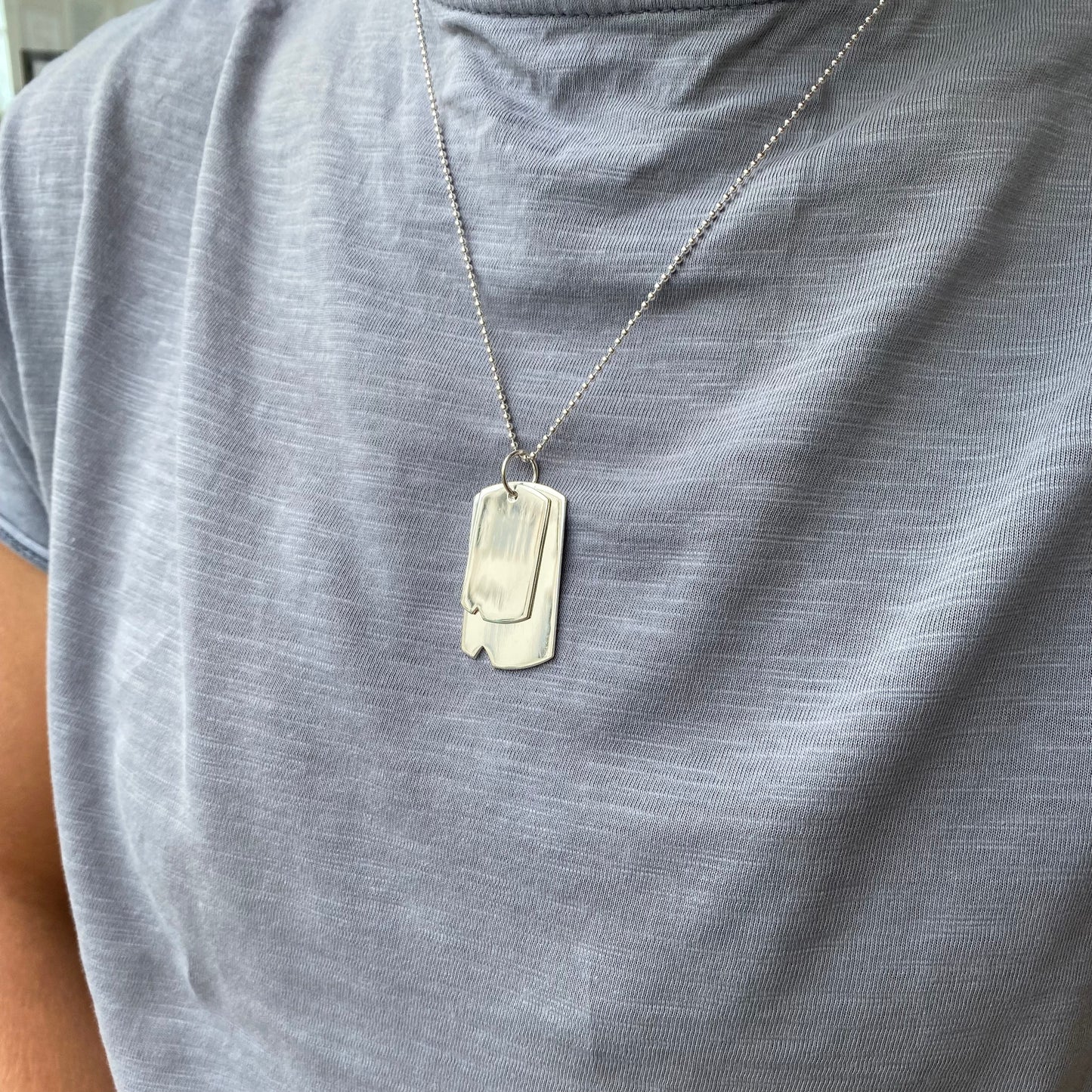 This is double tag necklace with a slight cut out is made of 925 silver. Bothe tags have a polished front and back which can be engraved. The pendant hangs on an 20” bead chain.
