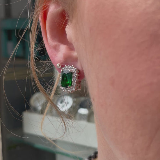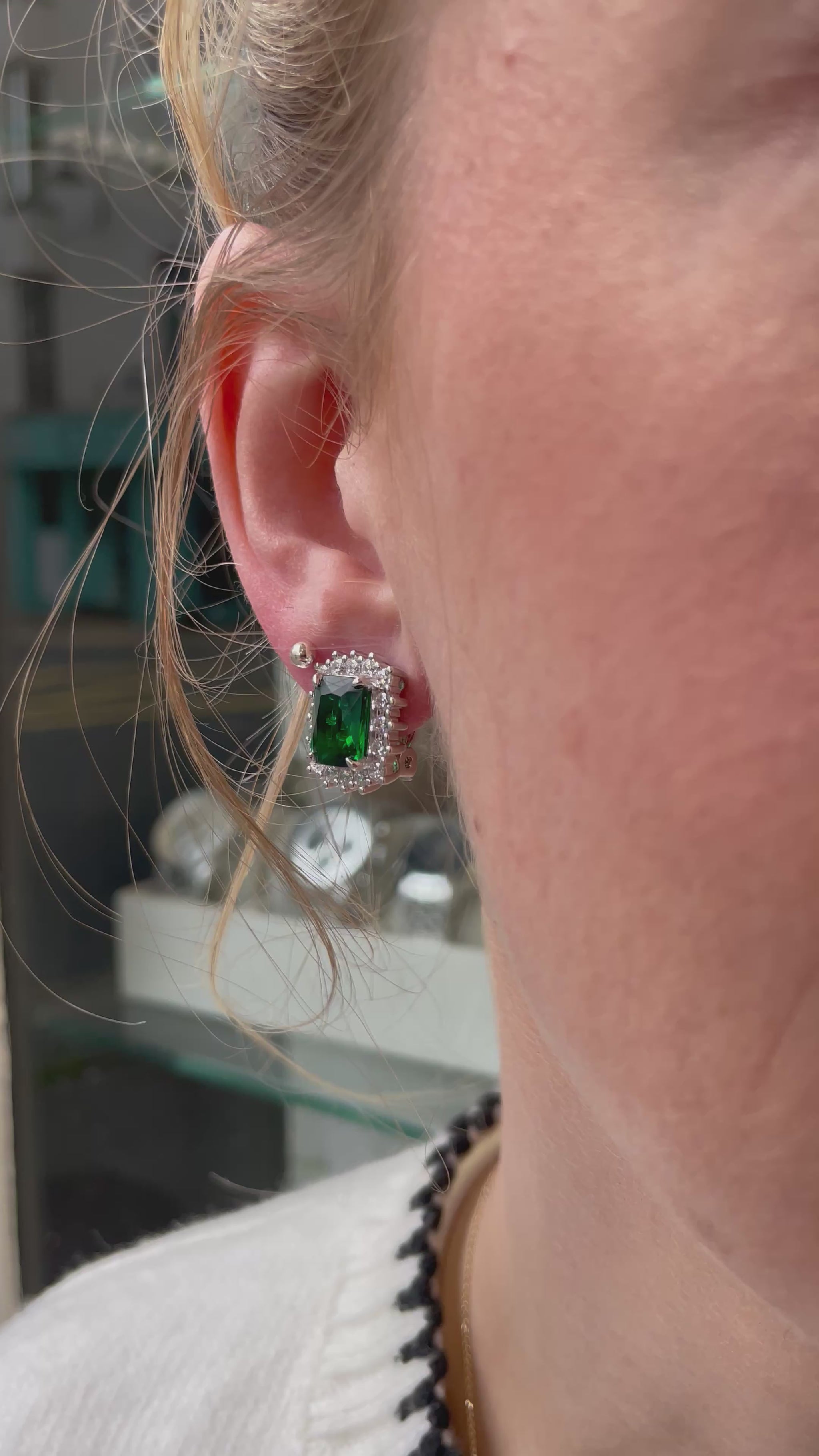 Silver Green CZ Emerald Cut Cluster Clip On Stud Earrings | 925 Silver