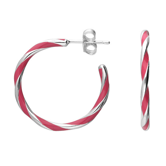 Silver Hot Pink Enamel Twist Hoop Earrings | 24mm