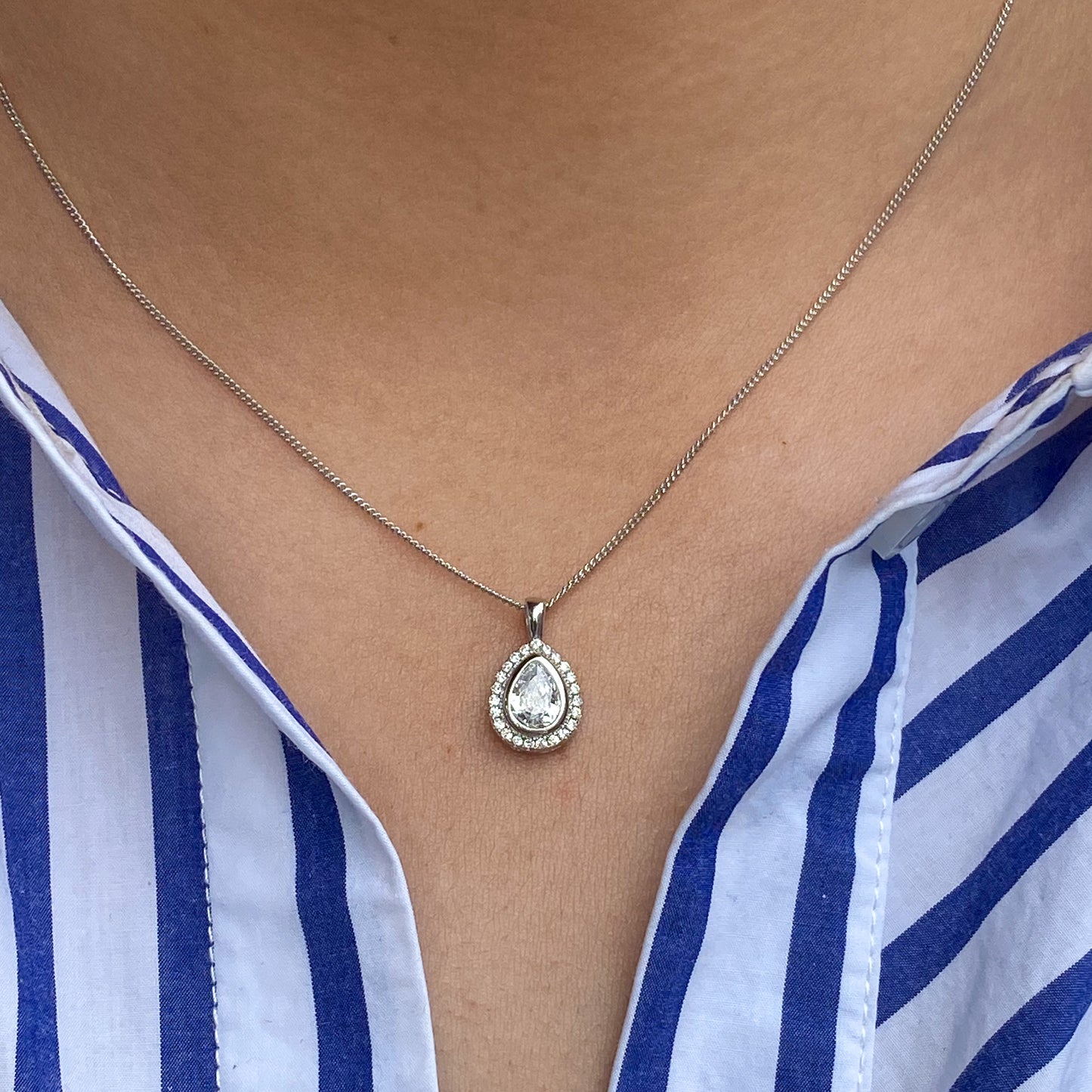 Rhodium Plated 925 Silver Pear CZ Halo Necklace | Small