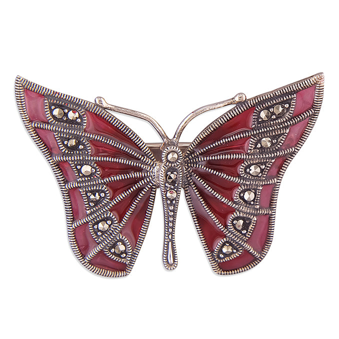 925 Silver Pink Resin & Marcasite Butterfly Brooch