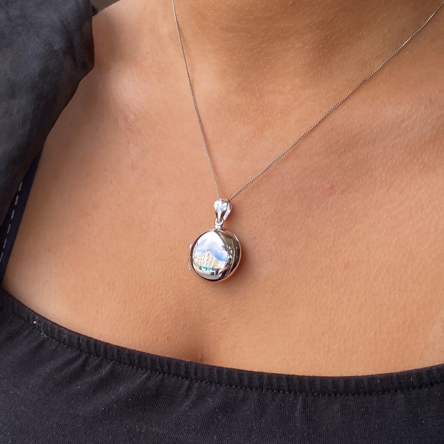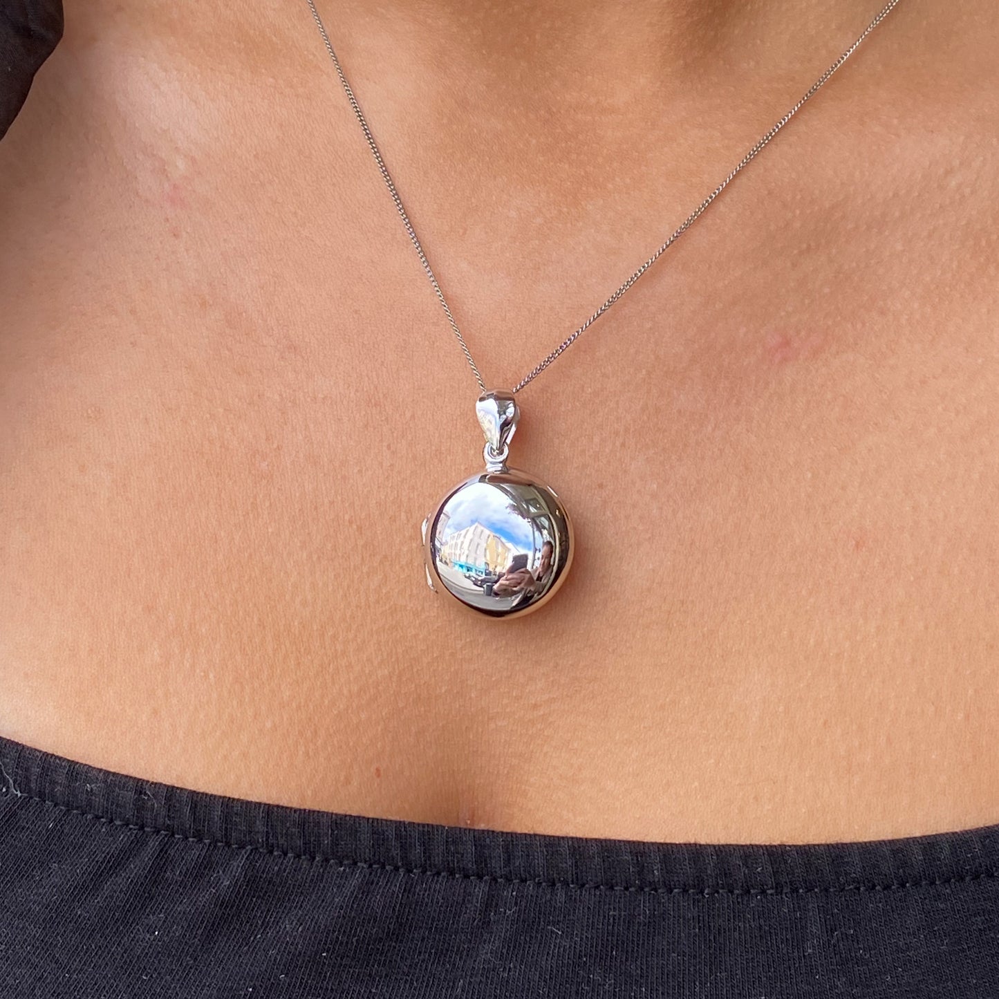 This 925 silver round locket holds two photos. It has a polished finish on both sides and can be engraved with a personal message. It hangs from a 925 silver 18" box chain. This is so classic and stylish. A completely "wear anytime" piece.