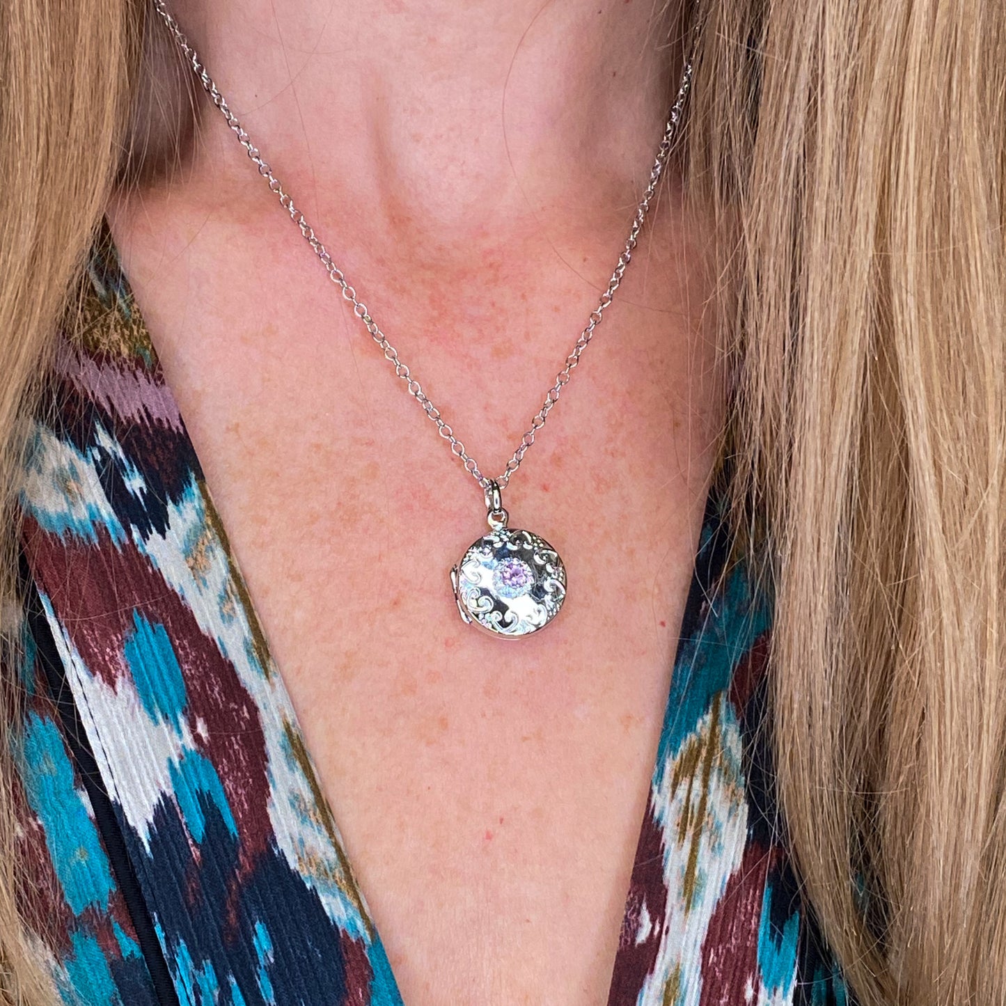 Silver Round Amethyst & CZ Embossed Locket and Chain