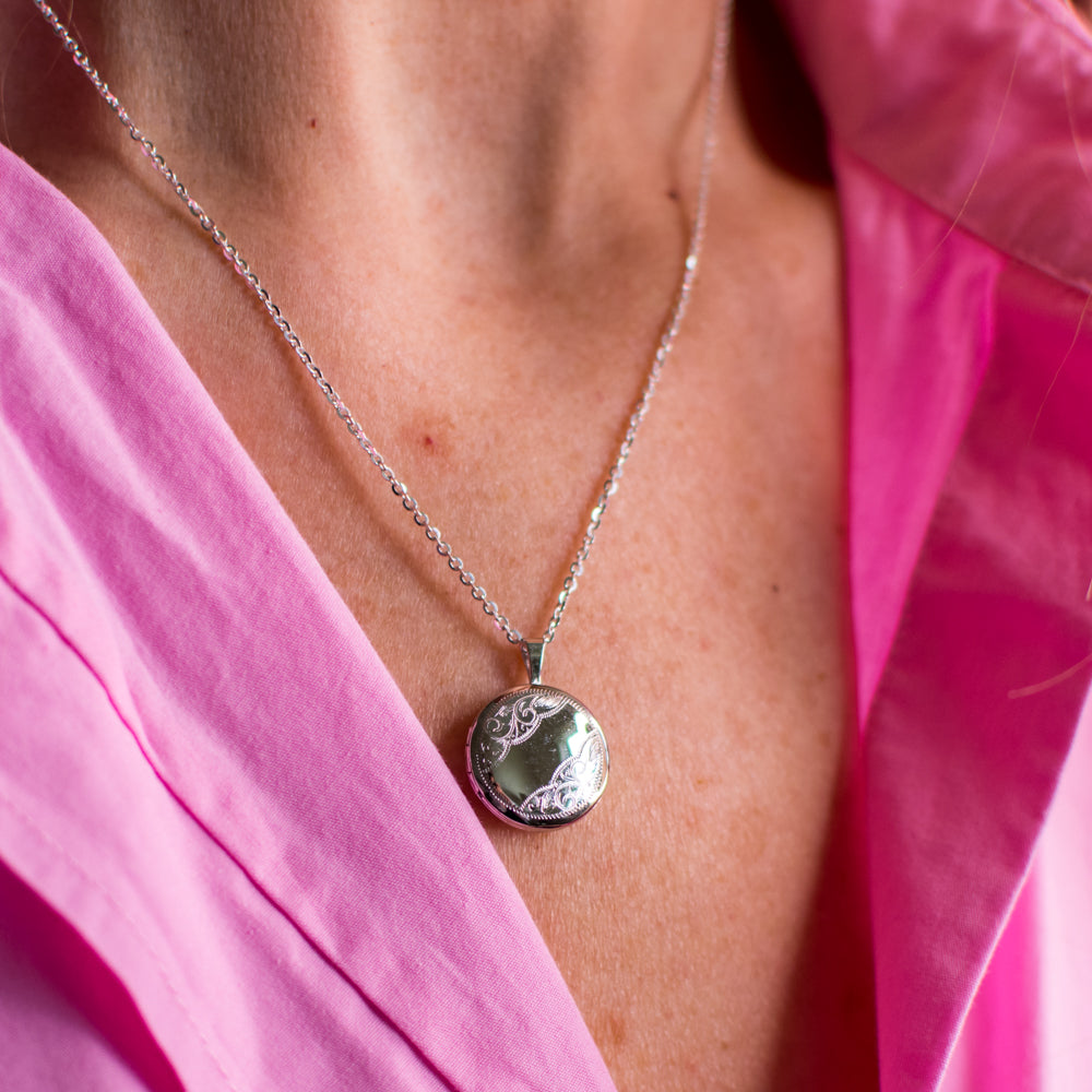 Silver Small Engraved Round Locket and Chain