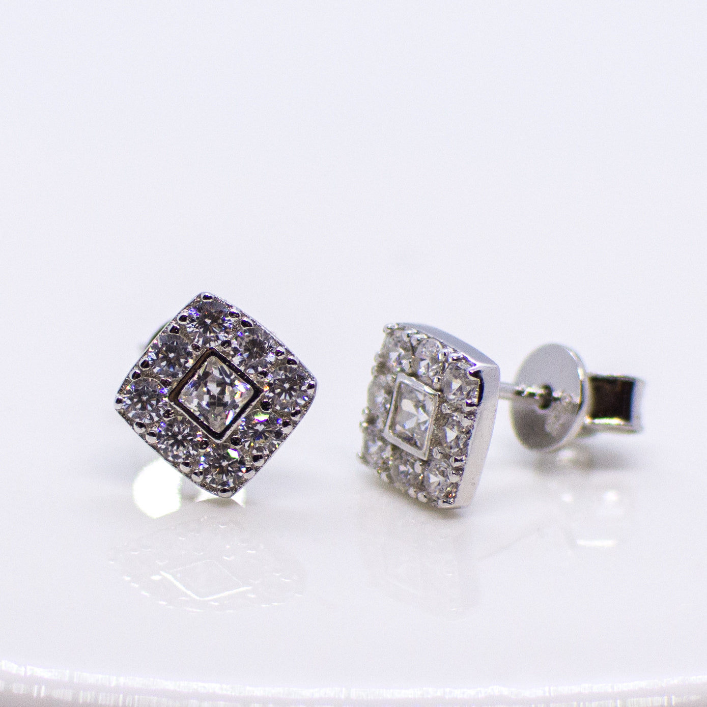 Silver Square Halo CZ Stud Earrings