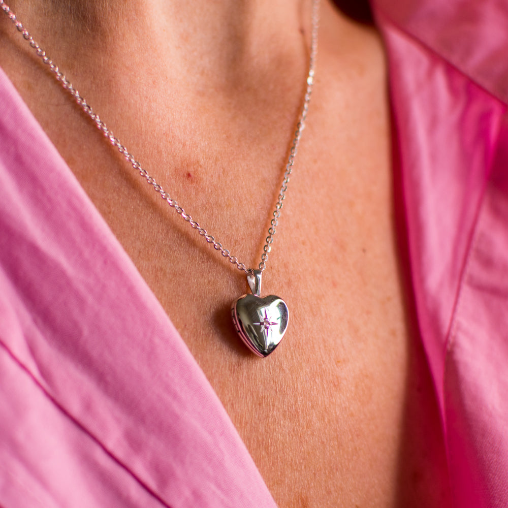 Silver Tiny Diamond Set Heart Locket and Chain
