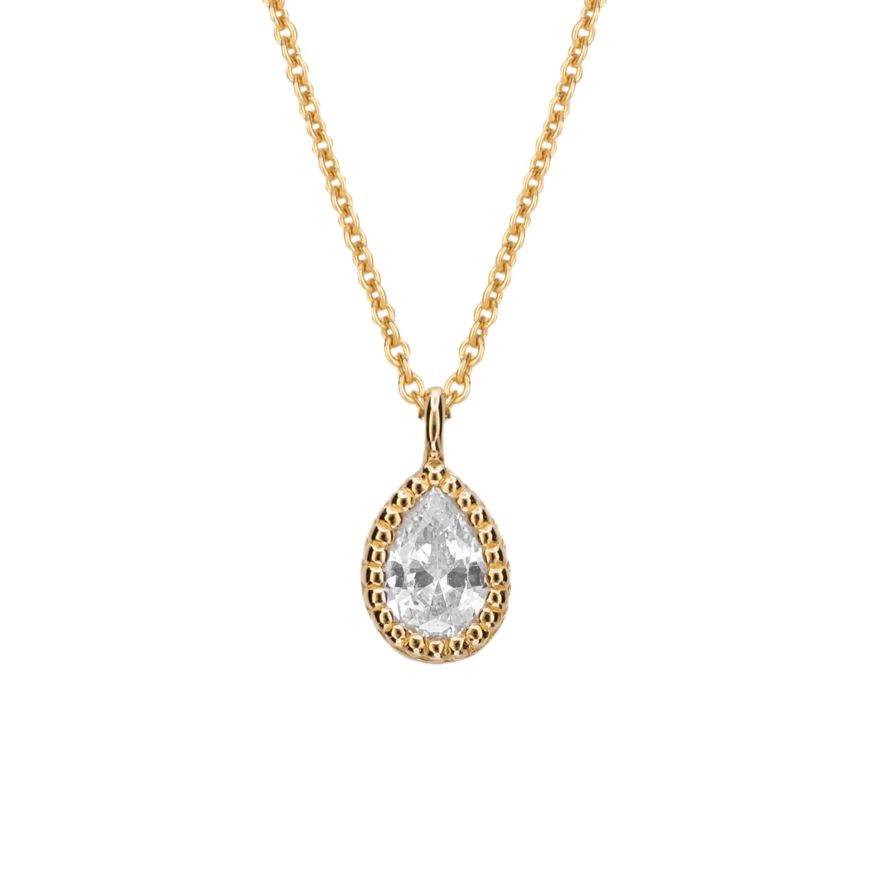 Gold plated 925 Silver necklace featuring a single pear cut CZ in the centre, millgrain set. Chain: 40-45cm long adjustable