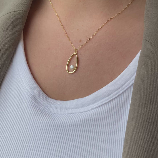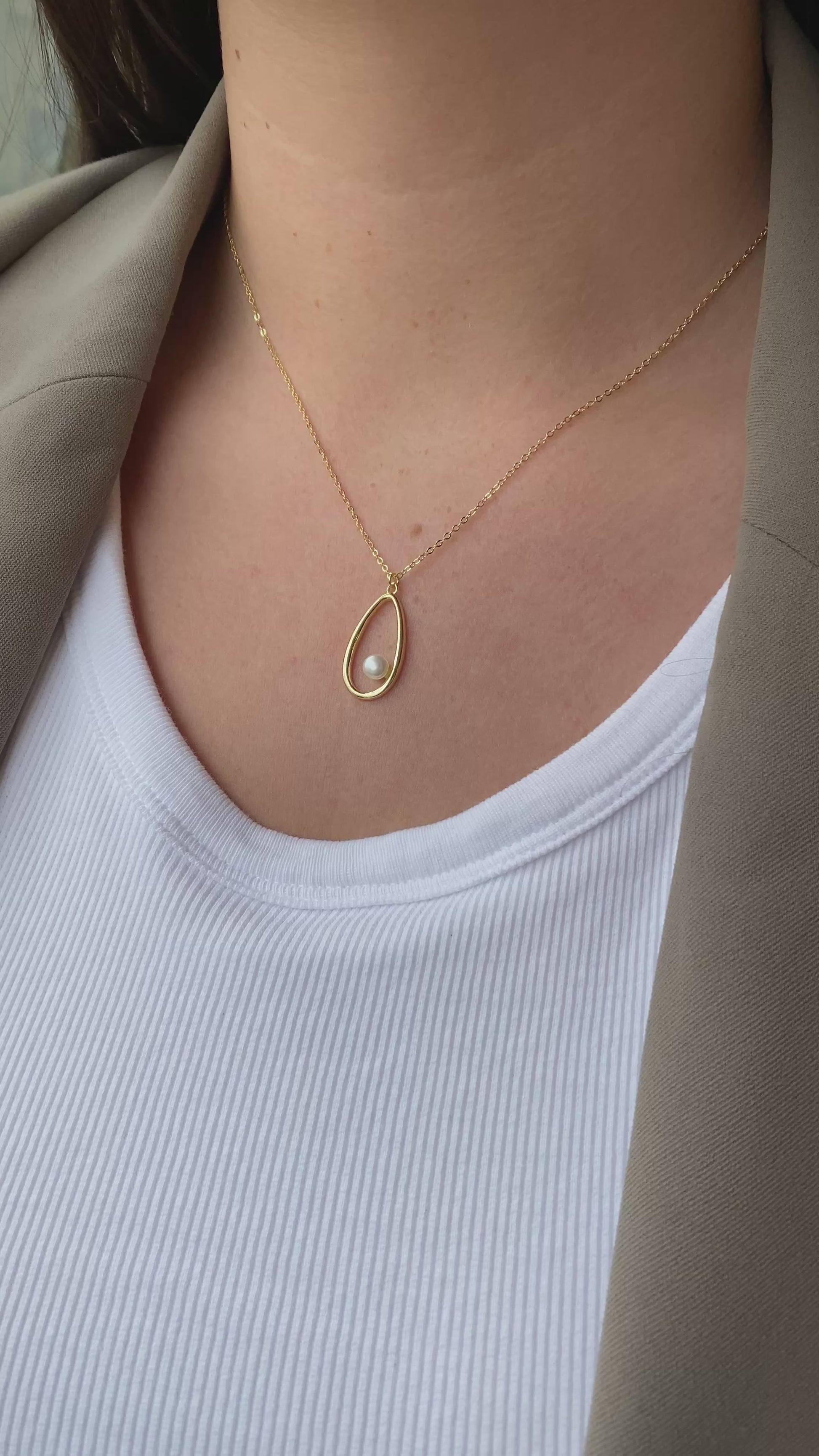 This elegant yellow gold plated necklace features a sterling silver open teardrop pendant with a 5mm freshwater pearl. Measuring 24.5mm in height, it hangs on a 16+2 inch adjustable chain. Lightweight at 2.5g, it’s perfect for a refined, timeless look.